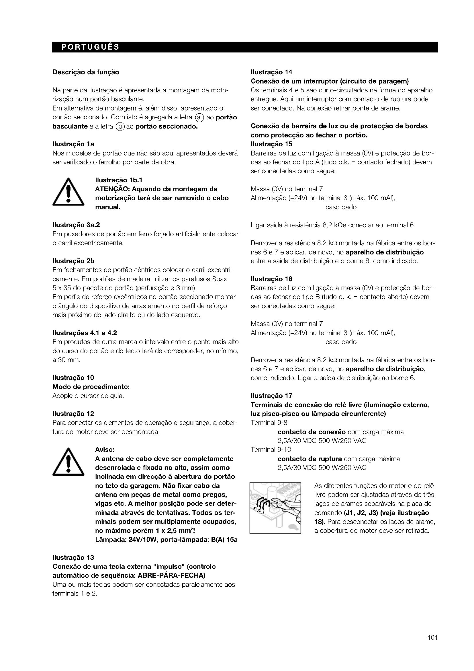 b ao portão seccionado. Ilustração 1a Nos modelos de portão que não são aqui apresentados deverá ser verificado o ferrolho por parte da obra. Ilustração 1b.1 ATENÇÃO: Aquando da montagem da motorização terá de ser removido o cabo manual. Ilustração 3a.2 Em puxadores de portão em ferro forjado artificialmente colocar o carril excentricamente. Ilustração 2b Em fechamentos de portão cêntricos colocar o carril excentri- camente. Em portões de madeira utilizar os parafusos Spax 5 x 35 do pacote do portão (perfuração ø 3 mm). Em perfis de reforço excêntricos no portão seccionado montar o ângulo do dispositivo de arrastamento no perfil de reforço mais próximo do lado direito ou do lado esquerdo. Ilustrações 4.1 e 4.2 Em produtos de outra marca o intervalo entre o ponto mais alto do curso do portão e do tecto terá de corresponder, no mínimo, a 30 mm. Ilustração 10 Modo de procedimento: Acople o cursor de guia. Ilustração 12 Para conectar os elementos de operação e segurança, a cober- tura do motor deve ser desmontada. Aviso: A antena de cabo deve ser completamente desenrolada e fixada no alto, assim como inclinada em direcção à abertura do portão no teto da garagem. Não fixar cabo da antena em peças de metal como pregos, vigas etc. A melhor posição pode ser deter- minada através de tentativas. Todos os ter- minais podem ser multiplamente ocupados, no máximo porém 1 x 2,5 mm