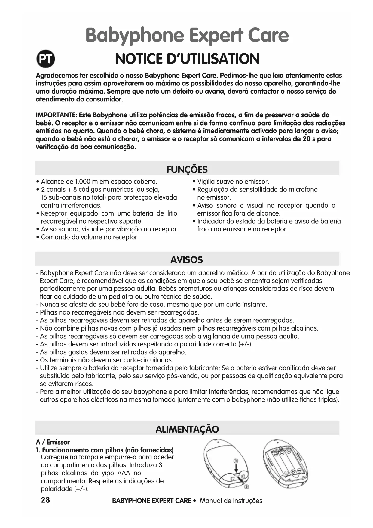 AVISOS - Babyphone Expert Care não deve ser considerado um aparelho médico. A par da utilização do BabyphoneExpert Care, é recomendável que as condições em que o seu bebé se encontra sejam verificadasperiodicamente por uma pessoa adulta. Bebés prematuros ou crianças consideradas de risco devemficar ao cuidado de um pediatra ou outro técnico de saúde.- Nunca se afaste do seu bebé fora de casa, mesmo que por um curto instante.- Pilhas não recarregáveis não devem ser recarregadas.- As pilhas recarregáveis devem ser retiradas do aparelho antes de serem recarregadas.- Não combine pilhas novas com pilhas já usadas nem pilhas recarregáveis com pilhas alcalinas.- As pilhas recarregáveis só devem ser carregadas sob a vigilância de uma pessoa adulta.- As pilhas devem ser introduzidas respeitando a polaridade correcta (+/-).- As pilhas gastas devem ser retiradas do aparelho.- Os terminais não devem ser curto-circuitados.- Utilize sempre a bateria do receptor fornecida pelo fabricante: Se a bateria estiver danificada deve sersubstiuída pelo fabricante, pelo seu serviço pós-venda, ou por pessoas de qualificação equivalente parase evitarem riscos.- Para a melhor utilização do seu babyphone e para limitar interferências, recomendamos que não ligueoutros aparelhos eléctricos na mesma tomada juntamente com o babyphone (não utilize fichas triplas). ALIMENTAÇÃO A / Emissor1. Funcionamento com pilhas (não fornecidas)Carregue na tampa e empurre-a para acederao compartimento das pilhas. Introduza 3pilhas alcalinas do yipo AAA nocompartimento. Respeite as indicações depolaridade (+/-). Babyphone Expert Care