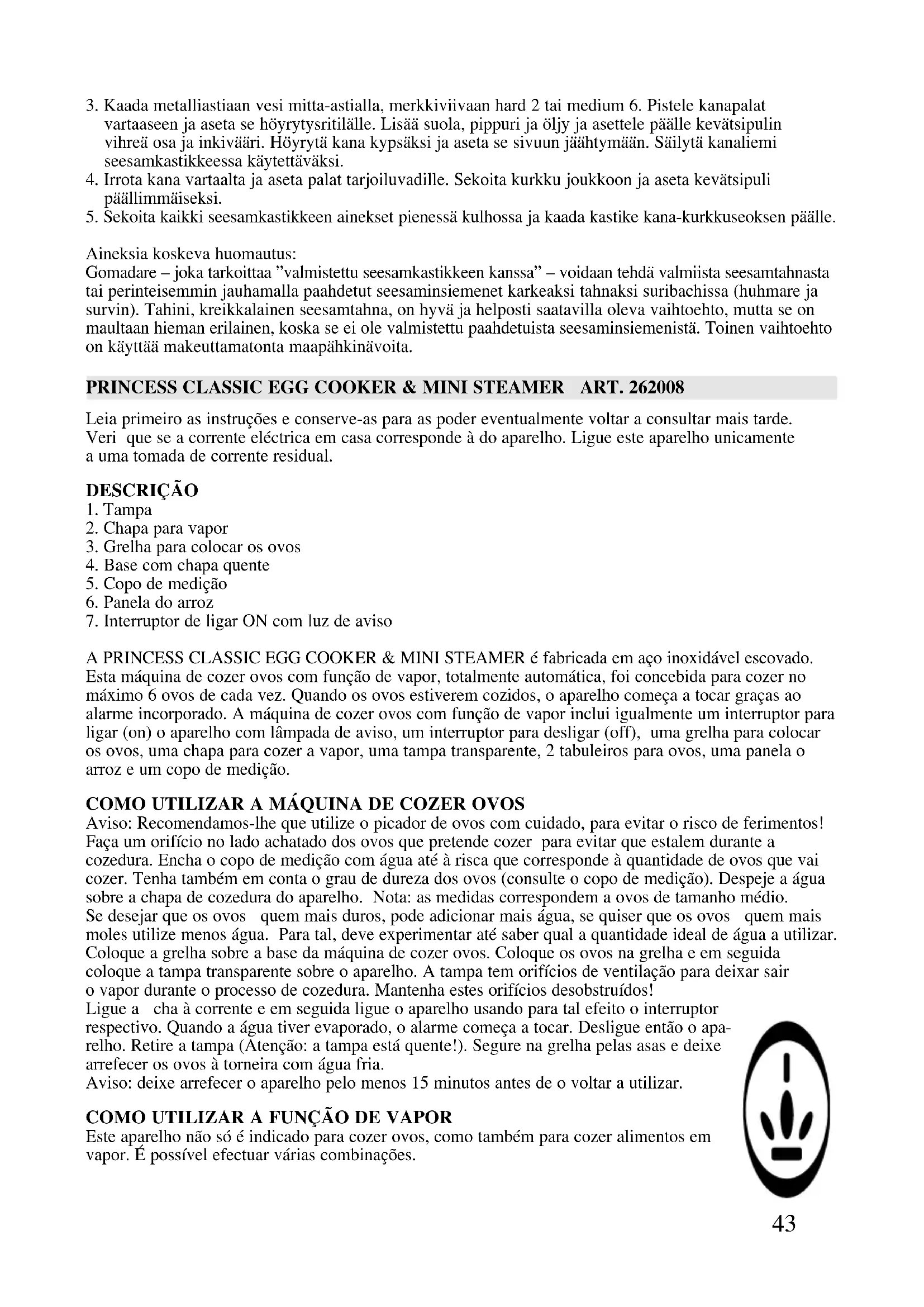 Encontre gratuitamente o manual do aparelho Classic Egg Cooker & Mini Steamer 262008 PRINCESS em formato PDF.