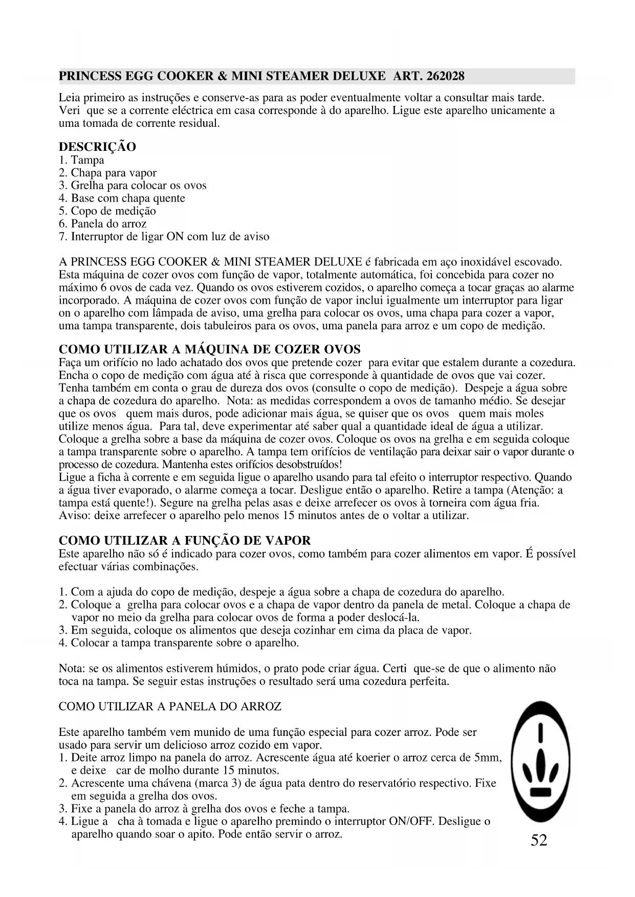A PRINCESS EGG COOKER & MINI STEAMER DELUXE é fabricada em aço inoxidável escovado. Esta máquina de cozer ovos com função de vapor, totalmente automática, foi concebida para cozer no máximo 6 ovos de cada vez. Quando os ovos estiverem cozidos, o aparelho começa a tocar graças ao alarme incorporado. A máquina de cozer ovos com função de vapor inclui igualmente um interruptor para ligar on o aparelho com lâmpada de aviso, uma grelha para colocar os ovos, uma chapa para cozer a vapor, uma tampa transparente, dois tabuleiros para os ovos, uma panela para arroz e um copo de medição. COMO UTILIZAR A MÁQUINA DE COZER OVOS Faça um orifício no lado achatado dos ovos que pretende cozer para evitar que estalem durante a cozedura. Encha o copo de medição com água até à risca que corresponde à quantidade de ovos que vai cozer. Tenha também em conta o grau de dureza dos ovos (consulte o copo de medição). Despeje a água sobre a chapa de cozedura do aparelho. Nota: as medidas correspondem a ovos de tamanho médio. Se desejar que os ovos fiquem mais duros, pode adicionar mais água, se quiser que os ovos fiquem mais moles utilize menos água. Para tal, deve experimentar até saber qual a quantidade ideal de água a utilizar. Coloque a grelha sobre a base da máquina de cozer ovos. Coloque os ovos na grelha e em seguida coloque a tampa transparente sobre o aparelho. A tampa tem orifícios de ventilação para deixar sair o vapor durante o processo de cozedura. Mantenha estes orifícios desobstruídos! Ligue a ficha à corrente e em seguida ligue o aparelho usando para tal efeito o interruptor respectivo. Quando a água tiver evaporado, o alarme começa a tocar. Desligue então o aparelho. Retire a tampa (Atenção: a tampa está quente!). Segure na grelha pelas asas e deixe arrefecer os ovos à torneira com água fria. Aviso: deixe arrefecer o aparelho pelo menos 15 minutos antes de o voltar a utilizar. COMO UTILIZAR A FUNÇÃO DE VAPOR Este aparelho não só é indicado para cozer ovos, como também para cozer alimentos em vapor. É possível efectuar várias combinações.