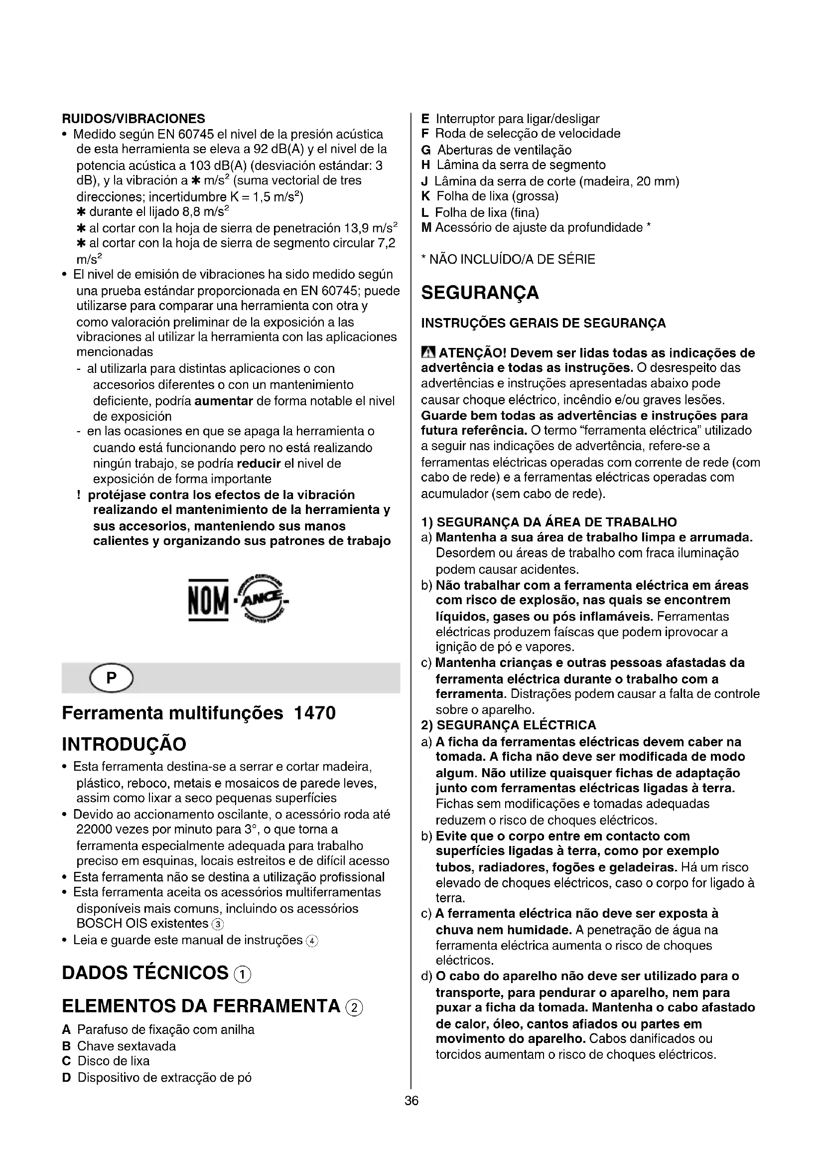 - Medido segundo EN 60745 o nível de pressão acústica desta ferramenta é 92 dB(A) e o nível de potência acústica 103 dB(A) (espaço de erro: 3 dB), e a vibração ✱ m/s² (soma de vectores de três direcções; incerteza K = 1,5 m/s²) ✱ durante a lixage 8,8 m/s² ✱ ao cortar com a lâmina da serra de corte 13,9 m/s² ✱ ao cortar com a lâmina da serra de segmento 7,2 m/s²
