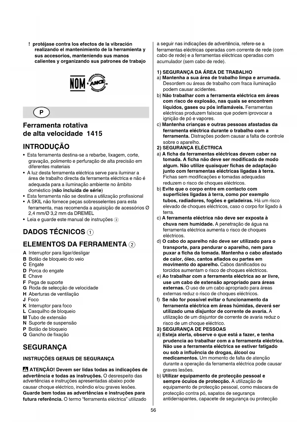 A Interruptor para ligar/desligar B Botão de bloqueio do veio C Engate D Porca do engate E Chave F Pega de suporte G Roda de selecção de velocidade H Aberturas de ventilação J Foco K Interruptor para foco L Casquilho de bloqueio M Tubo de extensão N Suporte de suspensão P Botão de bloqueio Q Gancho de xação SEGURANÇA