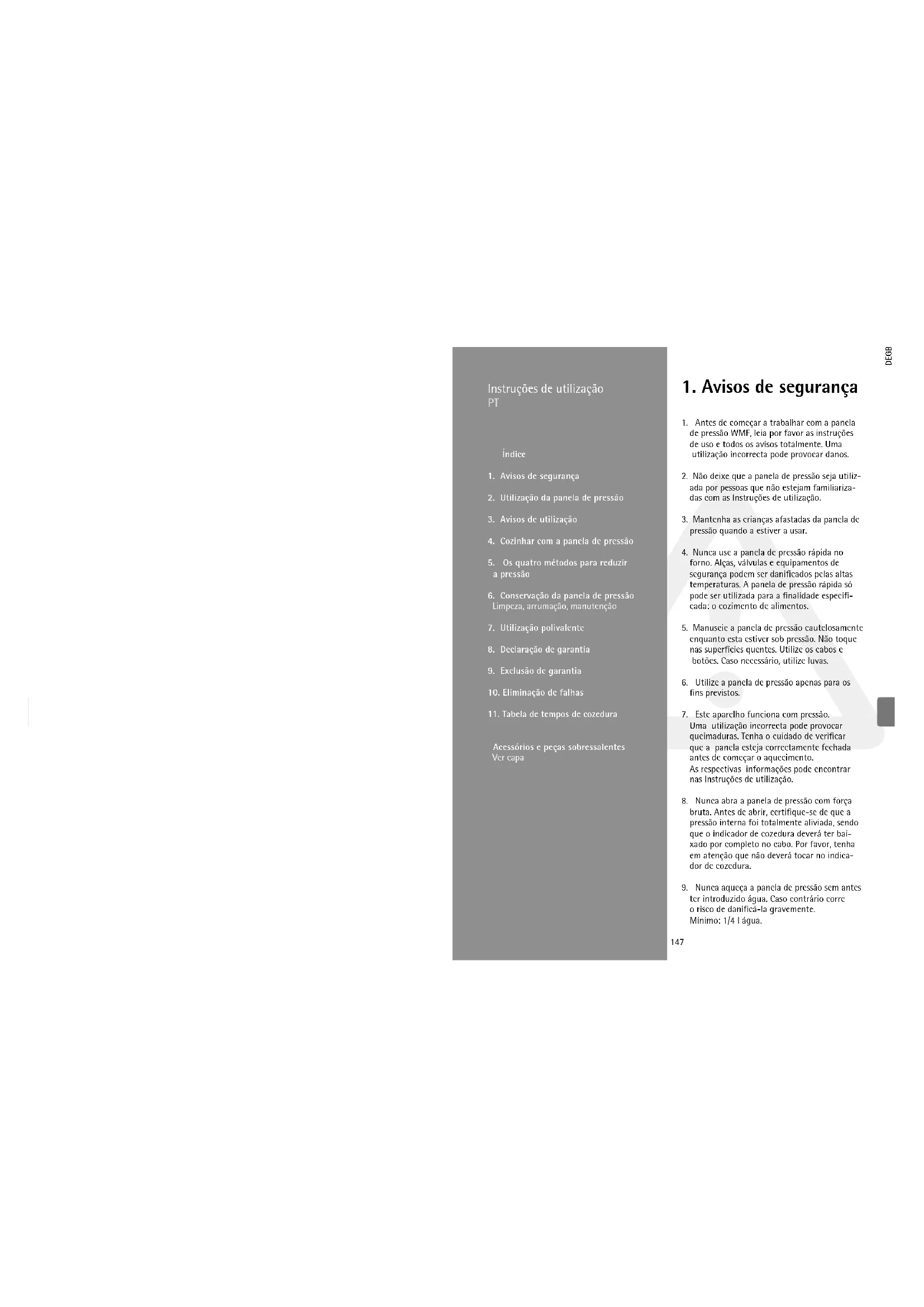 Após a conclusão do tempo de cozedura tire a panela de pressão da fonte de aquecimento. Por princípio só deve abrir a tampa e tirá-la da panela quando a panela estiver despressurizada, ou seja, o indicador de cozedura (1) deve estar153 DEGBESBGDKFIFRGRITNLNOPLPTRUSESKSICZTRHUHR 7.4. Fazer sumo Na panela de pressão pode fazer sumo de pequenas quantidades de fruta. Introduza 1/4l de água na panela. Coloque a fruta no cesto furado em cima do cesto fechado e acrescente açúcar qb. Cozinhar no 2˚ anel de cozedura laranja. Dependendo do tipo de fruta, o tempo de cozedura é 10–20 minutos. Despressurizar a panela debaixo do jorro de água (método 3). Mexer a panela brevemente antes de abrir. 7.5. Esterilizar Biberões, frascos de conserva etc. podem ser esterilizados rapidamente. Colocar as peças com a abertura virada para baixo no cesto furado, acrescentar 1/4 l de água e deixar esterilizar durante 20 min no 2˚ anel de cozedura laranja. Deixar arrefecer lentamente (método 1). 7.6. Cozinhar com cestos Dependendo do tamanho da panela de pressão pode cozinhar com os cestos e o tripé. Os cestos e o tripé são disponíveis como acessórios no comércio especializado. Também tem a possibilidade de preparar vários pratos ao mesmo tempo na panela de pressão. Para isso se distribui os diversos acompanhamentos em cestos diferentes. O alimento com o tempo de cozedura mais demorado é inserido primeiro, ou seja, em baixo, sem o cesto, na panela. Exemplos Assado (20 min) – no fundo da panela Batatas (8 min) – no cesto furado Legumes (8 min) – no cesto fechado Deixar cozinhar primeiro o assado durante 12 minutos. Depois abrir a panela conforme as instruções. Colocar as batatas no cesto furado no tripé e inserir os legumes no cesto fechado. Fechar a panela e deixar cozinhar durante mais 8 minutos. Se os tempos de cozedura não forem muito diferentes, pode colocar todos os cestos ao mesmo tempo na panela. Ao abrir a panela ao meio da cozedura sai vapor. Por isso introduza um pouco mais de líquido na panela.