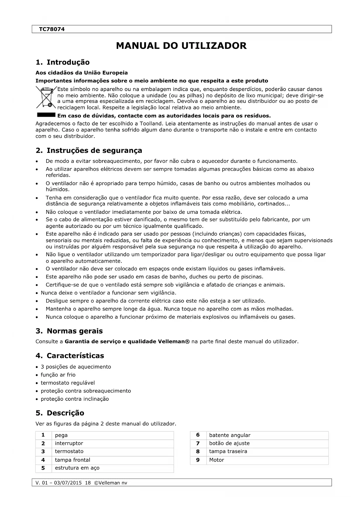 Utilize este aparelho apenas com acessórios originais. A Velleman NV não está responsavel por quando quer danos ou lesões causados pelo uso (indevido) do aparelho. Para mais informação sobre este produit e para aceder à versão mais recente deste manual do utilizesdor, visite a minha网页 www.toolland.eu. Podem alterar-se as espécicações e o conteudo destemanual sem征求意见.