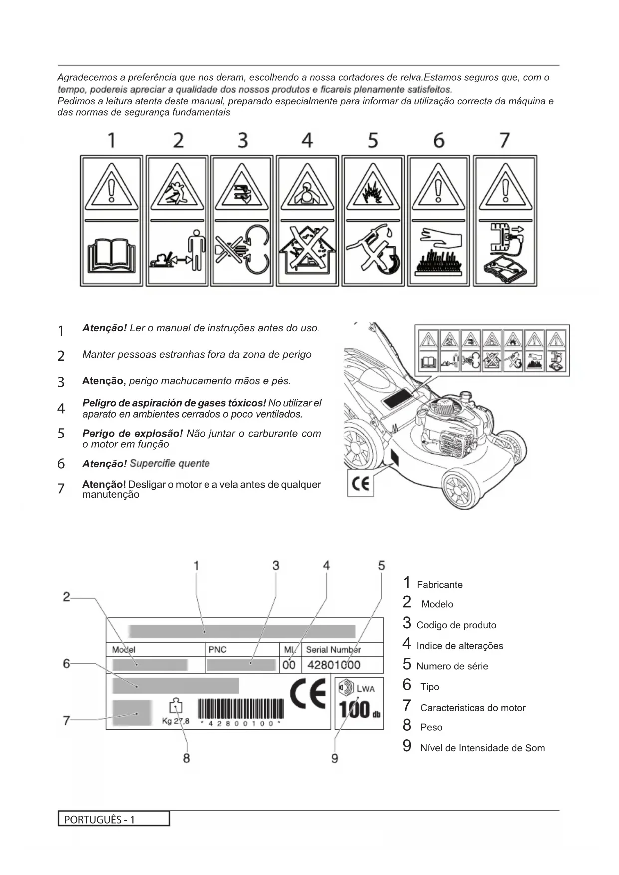 Peligro de aspiración de gases tóxicos! No utilizar el aparato en ambientes cerrados o poco ventilados. Perigo de explosão! Não juntar o carburante com o motor em função Atenção! Atenção! Desligar o motor e a vela antes de qualquer manutenção Agradecemos a preferência que nos deram, escolhendo a nossa cortadores de relva.Estamos seguros que, com o Pedimos a leitura atenta deste manual, preparado especialmente para informar da utilização correcta da máquina e das normas de segurança fundamentais 1 Fabricante 2 Modelo 3 Codigo de produto 4 Indice de alterações 5 Numero de série 6 Tipo 7 Caracteristicas do motor 8 Peso 9 Nível de Intensidade de SomPORTUGUÊS -