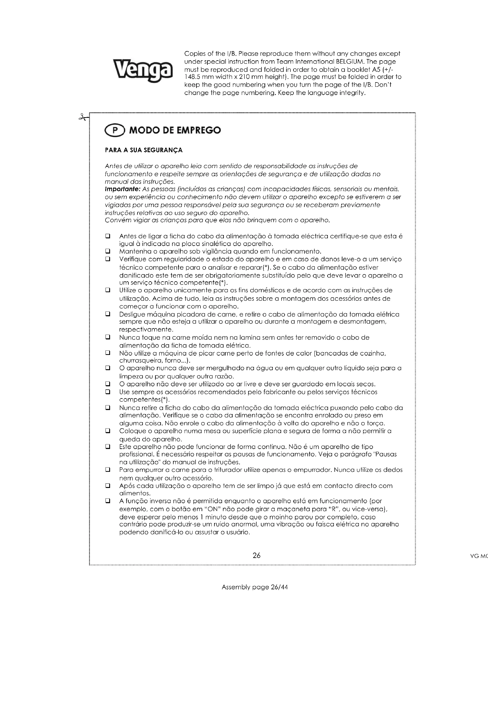 Nunca toque na carne moída nem na lamina sem antes ter removido o cabo de alimentação da ficha de tomada elétrica. Não utilize a máquina de picar carne perto de fontes de calor (bancadas de cozinha, churrasqueira, forno...). O aparelho nunca deve ser mergulhado na água ou em qualquer outro líquido seja para a limpeza ou por qualquer outra razão. O aparelho não deve ser utilizado ao ar livre e deve ser guardado em locais secos. Use sempre os acessórios recomendados pelo fabricante ou pelos serviços técnicos competentes(*). Nunca retire a ficha do cabo da alimentação da tomada eléctrica puxando pelo cabo da alimentação. Verifique se o cabo da alimentação se encontra enrolado ou preso em alguma coisa. Não enrole o cabo da alimentação à volta do aparelho e não o torça. Coloque o aparelho numa mesa ou superfície plana e segura de forma a não permitir a queda do aparelho. Este aparelho não pode funcionar de forma continua. Não é um aparelho de tipo profissional. É necessário respeitar as pausas de funcionamento. Veja o parágrafo "Pausas na utilização" do manual de instruções. Para empurrar a carne para o triturador utilize apenas o empurrador. Nunca utilize os dedos nem qualquer outro acessório. Após cada utilização o aparelho tem de ser limpo já que está em contacto directo com alimentos. A função inversa não é permitida enquanto o aparelho está em funcionamento (por exemplo, com o botão em “ON” não pode girar a maçaneta para “R”, ou vice-versa), deve esperar pelo menos 1 minuto desde que o moinho parou por completo, caso contrário pode produzir-se um ruído anormal, uma vibração ou faísca elétrica no aparelho podendo danificá-lo ou assustar o usuário. Assembly page 26/44Copies of the I/B. Please reproduce them without any changes except under special instruction from Team International BELGIUM. The page must be reproduced and folded in order to obtain a booklet A5 (+/-