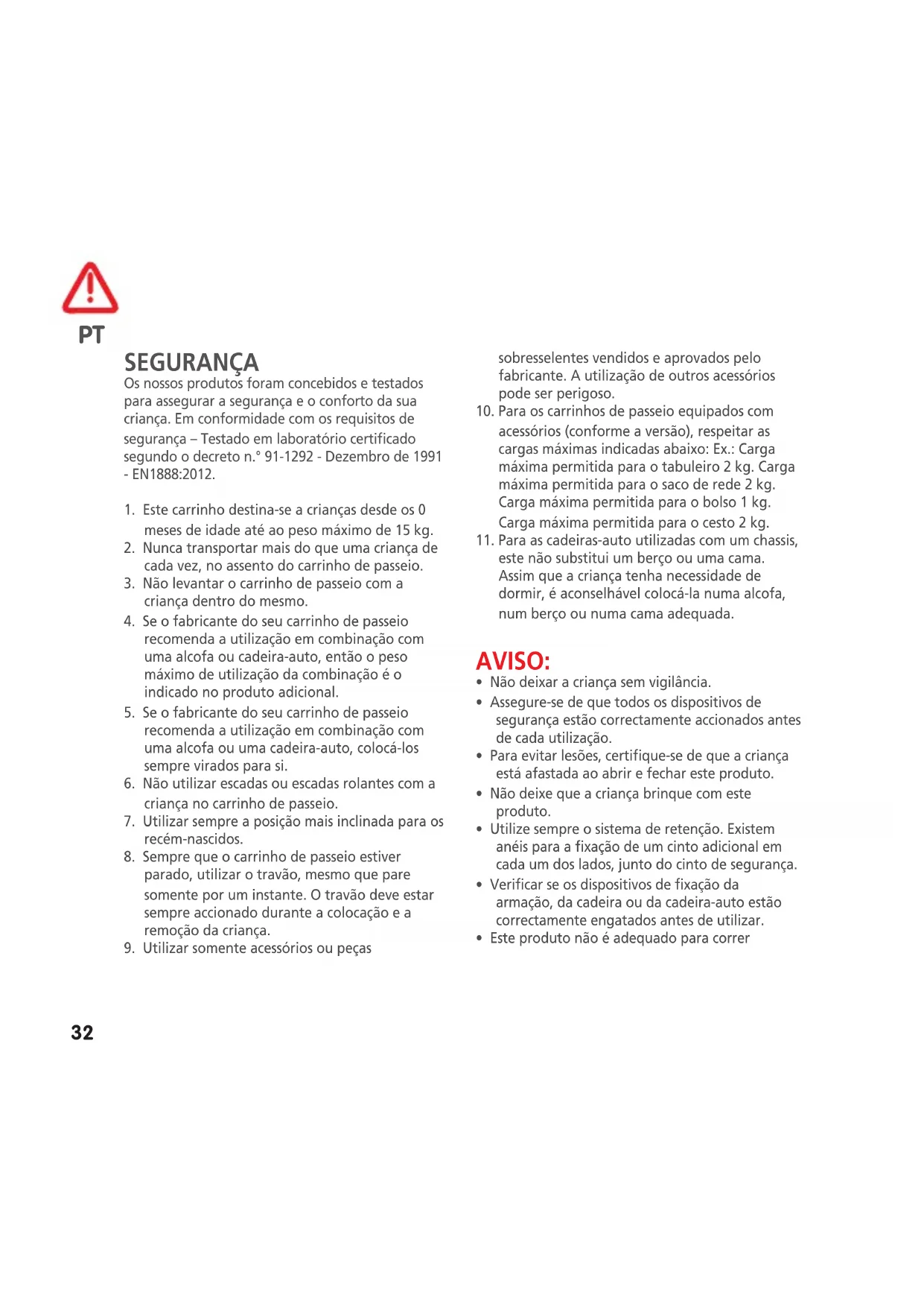 instruções. Ambiente Quando deixar de usar o produto, solicitamos, por razões ambientais, que elimine o seu produto fazendo a triagem e cumprindo com a legislação local nesta matéria. Perguntas Contacte o seu distribuidor local ou visite o nosso website. Tenha consigo as seguintes informações: - Número de série - A idade (o tamanho) e o peso do bebé. Garantia A nossa garantia de 24 meses reflete a nossa confiança na qualidade do nosso design, engenharia e produção, bem como no desempenho do produto. Garantimos que este produto foi fabricado de acordo com as normas de qualidade e os requisitos de segurança europeia atualmente em vigor para este produto, e que, à data da compra, o produto se encontra isento de defeitos de fabrico ou de materiais. Sob as condições aqui PT34 mencionadas, esta garantia pode ser invocada pelos consumidores nos países onde este produto foi vendido, por uma filial do Grupo Dorel, por um distribuidor ou revendedor autorizado. A nossa garantia de 24 meses abrange defeitos de fabrico e de materiais, quando o produto é utilizado em condições normais e em conformidade com as indicações constantes do manual do utilizador por um período de 24 meses a partir da data da compra inicial no revendedor pelo primeiro consumidor/ utilizador. De modo a solicitar as reparações ou peças sobresselentes ao abrigo da garantia a título de defeitos de material e de fabrico, o consumidor deverá apresentar o comprovativo da aquisição efetuada (talão de compra) durante os 24 meses que antecedem a requisição do serviço. A nossa garantia de 24 meses não se aplica a defeitos causados pelo desgaste normal, danos causados por acidentes, utilização abusiva, negligência, incêndio, contacto com líquidos ou outras causas externas, danos que sejam consequência do incumprimento do manual do utilizador, danos causados pela utilização com outro produto, danos causados por reparações feitas por alguém não autorizado, em caso de furto ou caso alguma etiqueta ou número de identificação tenha sido removido/alterado do produto. Exemplos de uso e desgaste normais são rodas e tecidos deteriorados em consequência de uma utilização regular e da natural degradação dos materiais e das cores devido ao desgaste normal do produto. Como proceder caso verifique a existência de defeitos: Na eventualidade de surgirem quaisquer problemas ou defeitos, a melhor opção para obter um serviço rápido será dirigir-se ao revendedor autorizado ou ao revendedor por nós reconhecido que reconhece a nossa Garantia de 24 meses (1) . Deverá apresentar o comprovativo da aquisição efetuada (talão de compra) no período de 24 meses que antecede a data de requisição do serviço. Será mais fácil se obtiver a pré-aprovação da sua requisição de serviço pelo Departamento de Manutenção [da marca]. Se apresentar uma reclamação válida no âmbito desta garantia, poderemos solicitar que devolva o produto ao revendedor autorizado ou revendedor por nós reconhecido ou que nos envie o produto de acordo com as nossas instruções. Pagaremos os custos do envio e de devolução se todas as instruções forem cumpridas. Os danos que não são cobertos pela garantia poderão ser reparados mediante o pagamento de tarifas razoáveis. Os danos e/ou defeitos não cobertos pela nossa garantia nem pelos direitos legais do consumidor e/ ou os danos e/ou defeitos em relação aos produtos que não são cobertos pela nossa garantia podem ser reparados a um preço razoável. Direitos do consumidor: Um consumidor possui direitos legais nos termos da legislação de proteção do consumidor aplicável, que pode variar de país para país. Os direitos do consumidor nos termos da legislação nacional aplicável não são afetados por esta garantia. PT35 Esta garantia é fornecida pela Dorel Netherlands. Estamos registados nos Países Baixos com o número de sociedade 17060920. A nossa morada comercial é Korendijk 5, 5704 RD Helmond, Países Baixos, e a nossa morada postal é P.O. Box 6071, 5700 ET Helmond, Países Baixos. Os nomes e moradas de outras filiais do grupo Dorel podem ser encontrados na última página deste manual e no nosso website. (1) Não são autorizados para esse efeito os produtos adquiridos que retirem ou alterem as etiquetas ou os números de identificação. Uma vez que não é possível averiguar a autenticidade destes produtos, não lhes será aplicável qualquer garantia. PT36 BEZPIECZEŃSTWO Nasze produkty zostały starannie zaprojektowane i sprawdzone, aby zapewnić dziecku bezpieczeństwo i wygodę. Niniejszy produkt jest zgodny z wymogami bezpieczeństwa – Sprawdzony w zatwierdzonym laboratorium z postanowieniem nr 91-1292 - Grudzień 1991 - EN1888:2012.