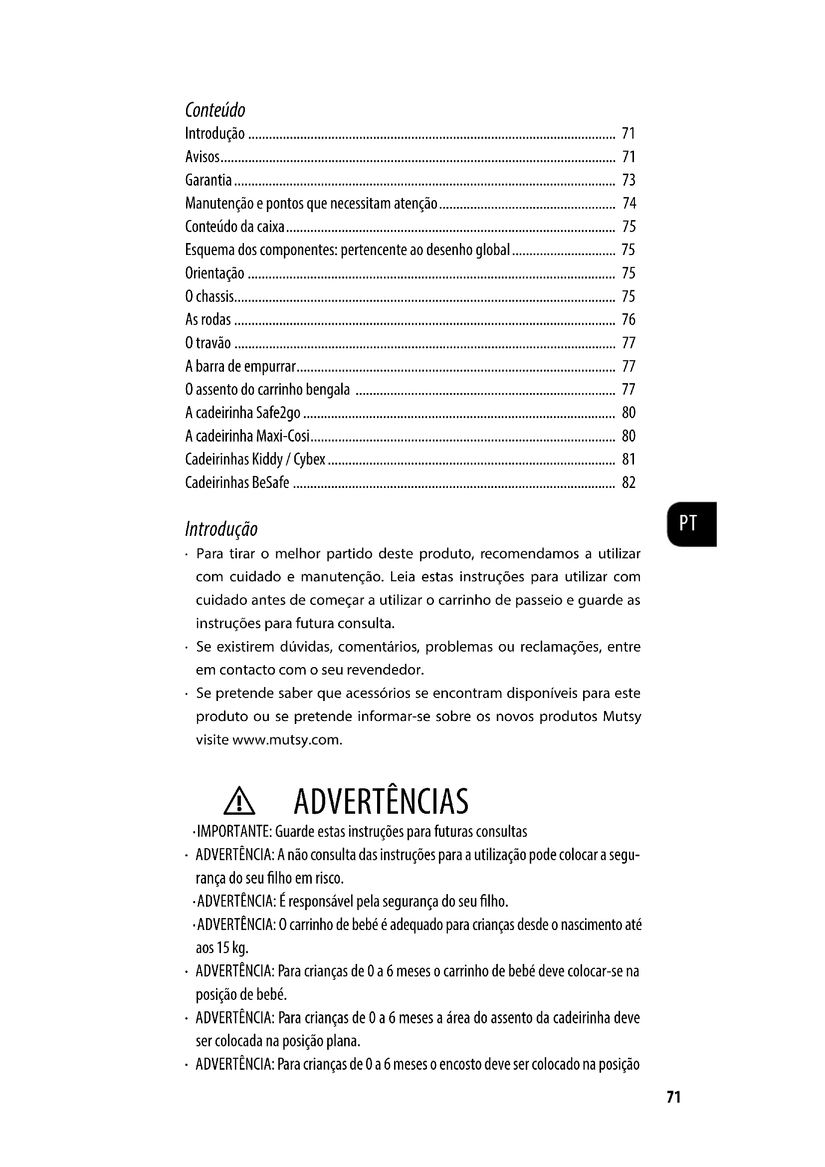 - Se pretende saber que acessórios se encontrar disponibles para este produit ou se pretende informar-se sobre os novos produits Mutsy visite www.mutsy.com.