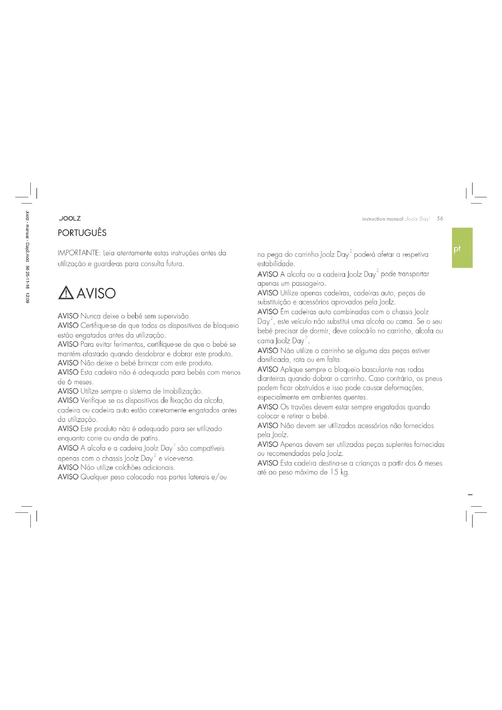 AVISO Não utilize o carrinho se alguma das peças estiver danificada, rota ou em falta. AVISO Aplique sempre o bloqueio basculante nas rodas dianteiras quando dobrar o carrinho. Caso contrário, os pneus podem ficar obstruídos e isso pode causar deformações, especialmente em ambientes quentes. AVISO Os travões devem estar sempre engatados quando colocar e retirar o bebé. AVISO Não devem ser utilizados acessórios não fornecidos pela Joolz. AVISO Apenas devem ser utilizadas peças suplentes fornecidas ou recomendadas pela Joolz. AVISO Esta cadeira destina-se a crianças a partir dos 6 meses até ao peso máximo de 15kg. PORTUGUÊS Joolz - manual - Day2.indd 56 25-11-16 12:0957 instruction manual Joolz Day