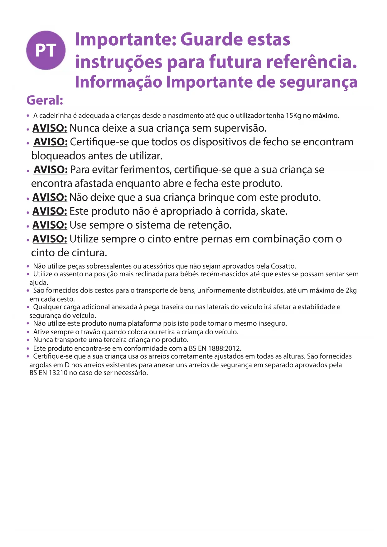 O seu carrinho de bébé foi concebido para ir de encontro aos padrões compreensivos de segurança, e com uma utilização e manutenção correta irá oferecer-lhe muitos anos de desempenho sem problemas.