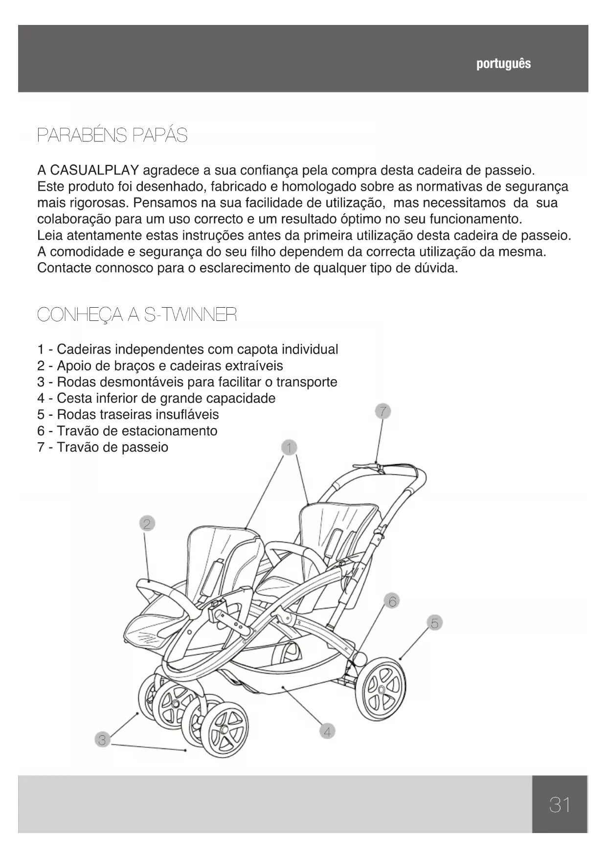 A CASUALPLAY agradece a sua conança pela compra desta cadeira de passeio. Este produto foi desenhado, fabricado e homologado sobre as normativas de segurança mais rigorosas. Pensamos na sua facilidade de utilização, mas necessitamos da sua colaboração para um uso correcto e um resultado óptimo no seu funcionamento. Leia atentamente estas instruções antes da primeira utilização desta cadeira de passeio. A comodidade e segurança do seu lho dependem da correcta utilização da mesma. Contacte connosco para o esclarecimento de qualquer tipo de dúvida.