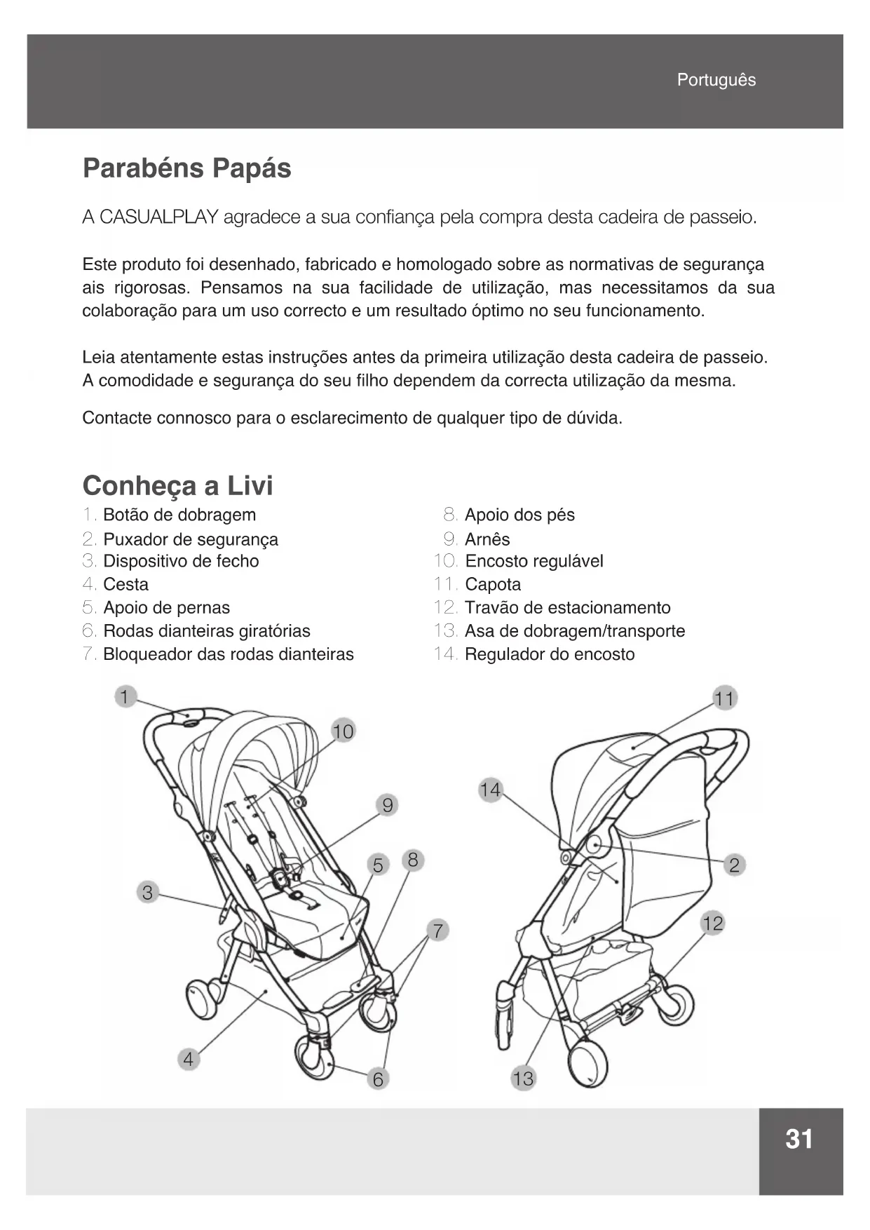 Parabéns Papás A CASUALPLAY agradece a sua conança pela compra desta cadeira de passeio. Este produto foi desenhado, fabricado e homologado sobre as normativas de segurança ais rigorosas. Pensamos na sua facilidade de utilização, mas necessitamos da sua colaboração para um uso correcto e um resultado óptimo no seu funcionamento. Leia atentamente estas instruções antes da primeira utilização desta cadeira de passeio. A comodidade e segurança do seu lho dependem da correcta utilização da mesma. Contacte connosco para o esclarecimento de qualquer tipo de dúvida. Conheça a Livi PortuguêsIMPORTANTE - CONSERVAR PARA FUTURAS REFERÊNCIAS Este veículo é para crianças a partir dos 0 meses e até aos 15 kg. ADVERTÊNCIA: Nunca deixe a criança sozinha. ADVERTÊNCIA: Assegure-se de que todos os dispositivos de bloqueio estão engatados antes de usar. ADVERTÊNCIA: Para evitar lesões assegure-se de que a criança se mantém afastada quando se dobre e desdobra este produto. ADVERTÊNCIA: Não permita que a criança brinque com este produto. ADVERTÊNCIA: Use sempre o sistema de retenção. ADVERTÊNCIA: Comprovar se os dispositivos de sujeição do carrinho e do assento estão corretamente ativados antes de usar os mesmos. ADVERTÊNCIA: Este produto não é adequado para correr ou patinar.