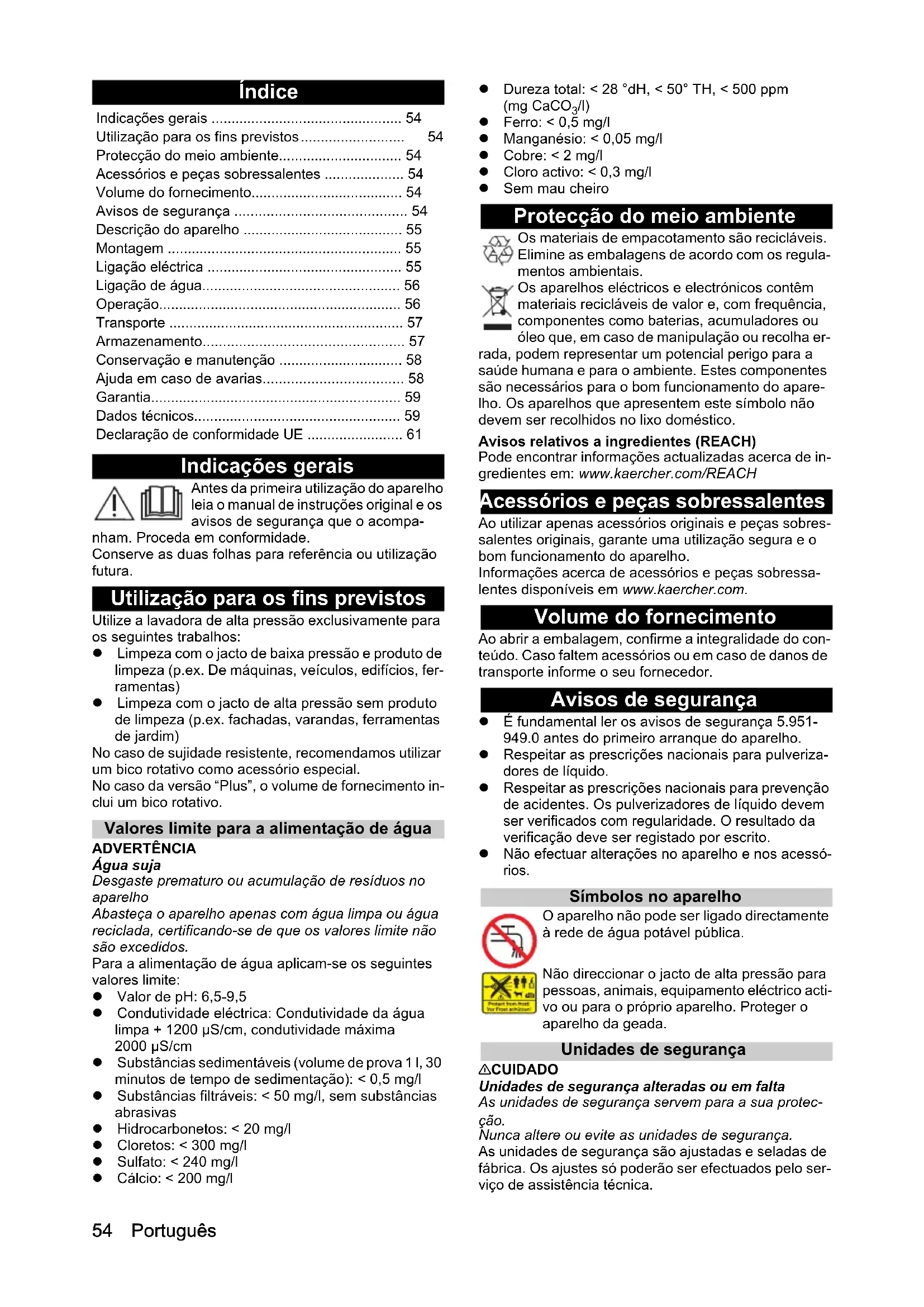 Chairman of the Board of Management Director Regulatory Affairs & Certification H. Jenner S. Reiser54 Português Índice Indicações gerais Antes da primeira utilização do aparelho leia o manual de instruções original e os avisos de segurança que o acompa- nham. Proceda em conformidade. Conserve as duas folhas para referência ou utilização futura. Utilização para os fins previstos Utilize a lavadora de alta pressão exclusivamente para os seguintes trabalhos: Limpeza com o jacto de baixa pressão e produto de limpeza (p.ex. De máquinas, veículos, edifícios, fer- ramentas) Limpeza com o jacto de alta pressão sem produto de limpeza (p.ex. fachadas, varandas, ferramentas de jardim) No caso de sujidade resistente, recomendamos utilizar um bico rotativo como acessório especial. No caso da versão “Plus”, o volume de fornecimento in- clui um bico rotativo. Valores limite para a alimentação de água ADVERTÊNCIA Água suja Desgaste prematuro ou acumulação de resíduos no aparelho Abasteça o aparelho apenas com água limpa ou água reciclada, certificando-se de que os valores limite não são excedidos. Para a alimentação de água aplicam-se os seguintes valores limite: Valor de pH: 6,5-9,5 Condutividade eléctrica: Condutividade da água limpa + 1200 µS/cm, condutividade máxima 2000 µS/cm Substâncias sedimentáveis (volume de prova 1 l, 30 minutos de tempo de sedimentação): < 0,5 mg/l Substâncias filtráveis: < 50 mg/l, sem substâncias abrasivas Hidrocarbonetos: < 20 mg/l Cloretos: < 300 mg/l Sulfato: < 240 mg/l Cálcio: < 200 mg/l Dureza total: < 28 °dH, < 50° TH, < 500 ppm (mg CaCO