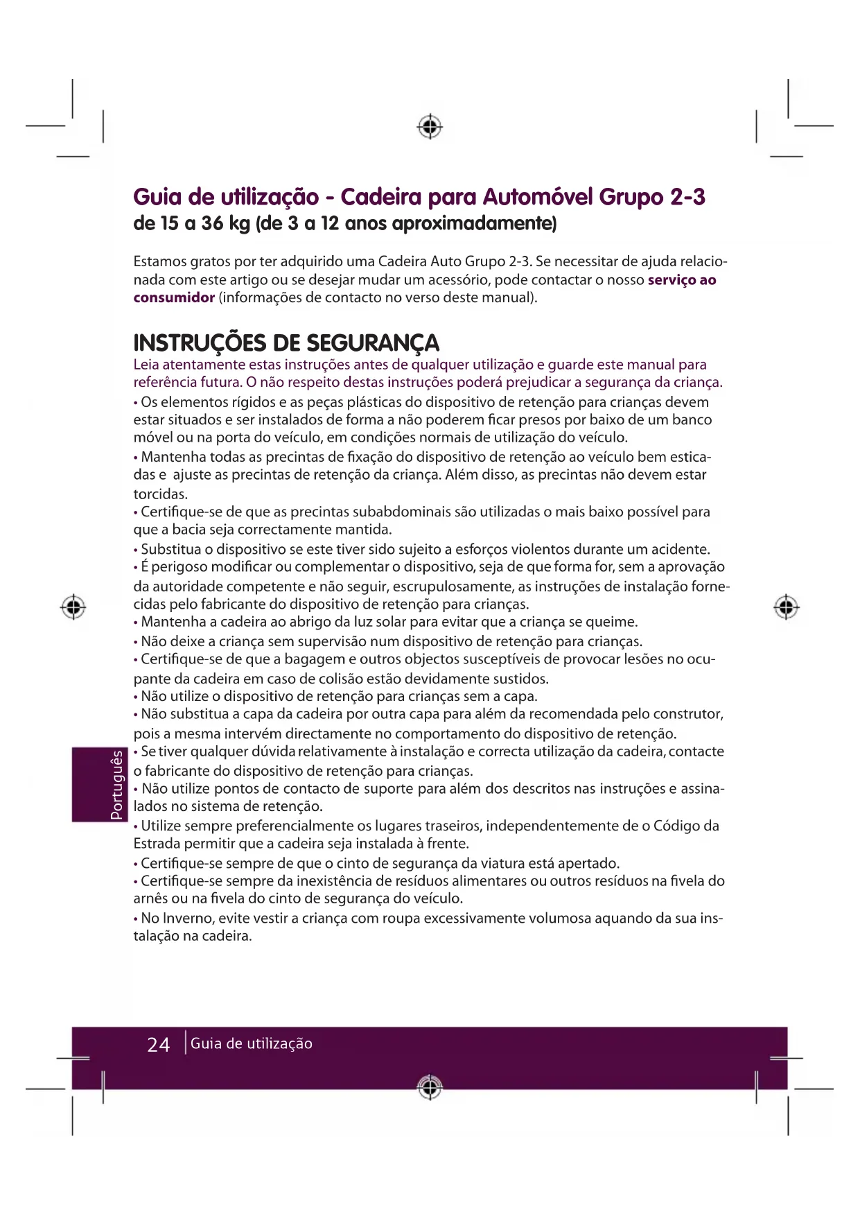 - Se tiver qualquer dúvida relativamente à instalação e correcta utilização da cadeira, contacte o fabricante do dispositivo de retenção para crianças.