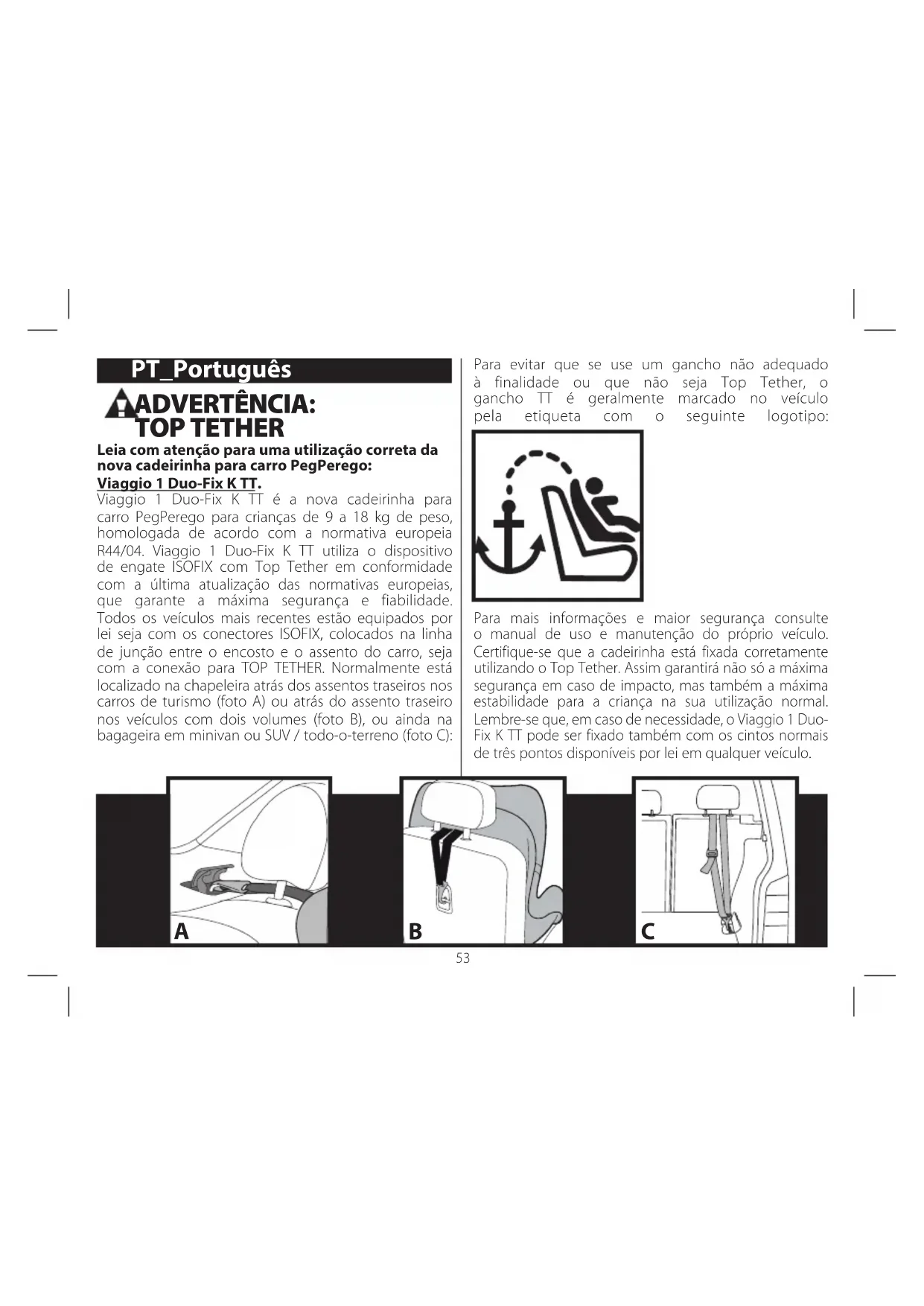 - Não utilize acessórios não aprovados pelo fabricante ou pelas autoridades competentes. Instruções de uso CATEGORIA UNIVERSAL Belted Fixação no carro com cintos de segurança 1• Monte a cadeirinha Viaggio 1 Duo-Fix K TT no assento no sentido de movimento do veículo como ilustrado na figura. A cadeirinha é equipada com uma base de protecção própria. Não a remova na instalação com cintos. 2• Para facilitar a passagem dos cintos de segurança do carro por trás da cadeirinha, é necessário reclinar o assento da cadeirinha para a posição mais baixa usando a alavanca como ilustrado na figura. 3• Passe o cinto de segurança do carro entre o chassis e a estrutura da cadeira. 4• O cinto abdominal tem de passar nas cavidades inferiores, evidenciadas pela cor vermelha. Afivele o cinto no assento até ouvir um clique. 5• Verifique se o cinto abdominal passa nas cavidades inferiores, evidenciadas pela cor vermelha e estique-o. 6• Volte a posicionar o assento da cadeira na posição vertical puxando a manilha presente debaixo da cadeirinha (Fig. a) e empurrando-a, como ilustrado na figura (Fig. b). 7• Para completar a fixação no carro, utilize o dispositivo steady fix: abra o gancho e passe o cinto diagonal verificando se está esticado e não torcido (Fig. a). Feche a lingueta de segurança (Fig. b).56 8• IMPORTANTE: segure o cinto e puxe-o com força para cima, para que a Viaggio 1 Duo-Fix K TT fique bem aderida ao assento do carro (Fig. c). No fim da operação é possível reclinar o assento da cadeirinha para a posição desejada (ponto 2). Instruções de uso CATEGORIA UNIVERSAL Isofix & Top Tether Fixação no carro com Isofix & Top Tether 9• Recline o assento da cadeirinha na posição mais baixa, usando a alavanca conforme indicado na figura; 10• Pressione a alavanca para a frente colocada no interior da base, como na figura, para remover os engates Isofix; 11• Abra na parte traseira a porta e remova os cintos Top Tether (TT ). Quando o gancho TT não for usado, volte a colocá-lo na porta e encaixe-o como ilustrado na figura. 12• Para encaixar os engates ISOFIX da cadeirinha aos ganchos ISOFIX do assento, pressione lateralmente de ambos os lados no corpo até sentir o clique, como na figura . IMPORTANTE: verifique o engate correto da cadeirinha certificando-se que os indicadores ao lado dos ganchos Isofix da cadeirinha fiquem verdes em ambas as partes, como na figura. 13• Para fazer aderir perfeitamente a cadeirinha ao assento, puxe o cinto dianteiro da base para si e simultaneamente empurre a cadeirinha contra o assento, como na figura Seta B. IMPORTANTE: com a operação concluída, mova a cadeirinha para verificar a fixação correta dos engates Isofix. 14• Para remover os engates ISOFIX da cadeirinha dos ganchos ISOFIX do assento, pressione lateralmente de ambos os lados o botão (Seta A). Os engates ISOFIX da cadeirinha se soltarão automaticamente. Coloque os conectores ISOFIX dentro da sua sede puxando o cinto dianteiro de sua respectiva base na sua direcção (Seta B)