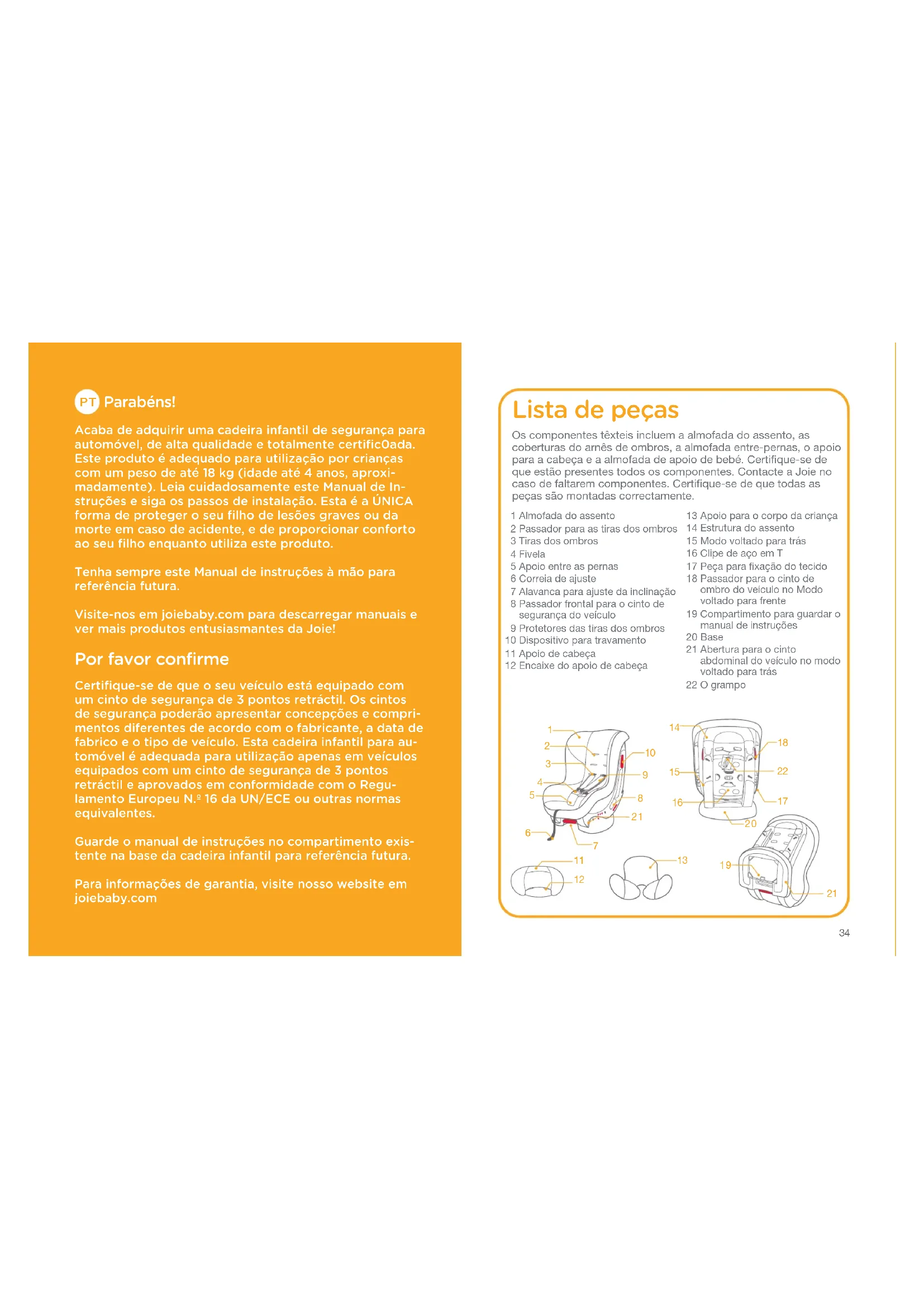 Lista de peças Os componentes têxteis incluem a almofada do assento, as coberturas do arnês de ombros, a almofada entre-pernas, o apoio para a cabeça e a almofada de apoio de bebé. Certifique-se de que estão presentes todos os componentes. Contacte a Joie no caso de faltarem componentes. Certifique-se de que todas as peças são montadas correctamente. Parabéns! Acaba de adquirir uma cadeira infantil de segurança para automóvel, de alta qualidade e totalmente certific0ada. Este produto é adequado para utilização por crianças com um peso de até 18 kg (idade até 4 anos, aproxi- madamente). Leia cuidadosamente este Manual de In- struções e siga os passos de instalação. Esta é a ÚNICA forma de proteger o seu filho de lesões graves ou da morte em caso de acidente, e de proporcionar conforto ao seu filho enquanto utiliza este produto. Tenha sempre este Manual de instruções à mão para referência futura. Visite-nos em joiebaby.com para descarregar manuais e ver mais produtos entusiasmantes da Joie! Por favor confirme Certifique-se de que o seu veículo está equipado com um cinto de segurança de 3 pontos retráctil. Os cintos de segurança poderão apresentar concepções e compri- mentos diferentes de acordo com o fabricante, a data de fabrico e o tipo de veículo. Esta cadeira infantil para au- tomóvel é adequada para utilização apenas em veículos equipados com um cinto de segurança de 3 pontos retráctil e aprovados em conformidade com o Regu- lamento Europeu N.º 16 da UN/ECE ou outras normas equivalentes. Guarde o manual de instruções no compartimento exis- tente na base da cadeira infantil para referência futura. Para informações de garantia, visite nosso website em joiebaby.com