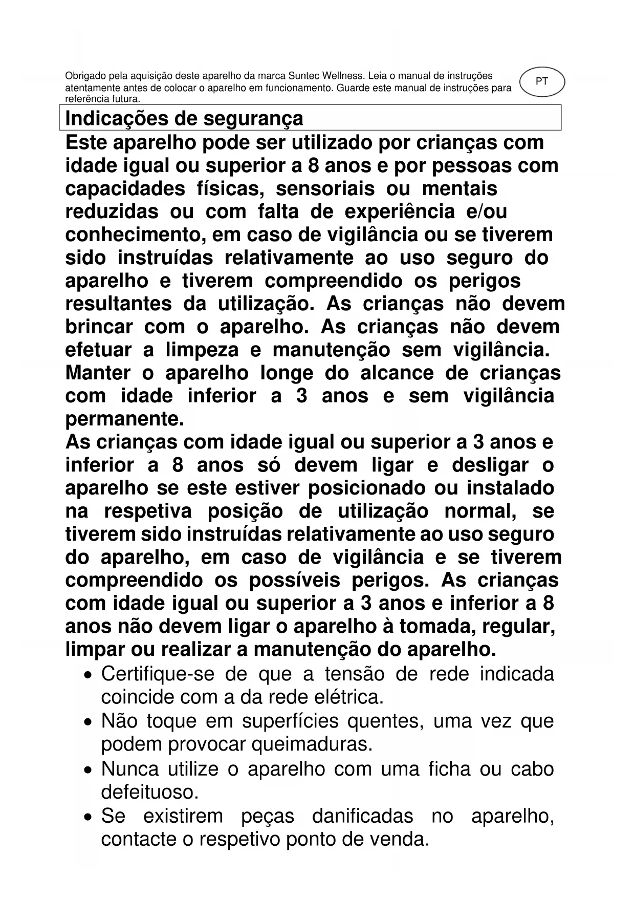 Heat Safe humid SUNTEC WELLNESS GMBH / HOLZSTRASSE 2 / 40221 DÜSSELDORF / GERMANYPT Obrigado pela aquisição deste aparelho da marca Suntec Wellness. Leia o manual de instruções atentamente antes de colocar o aparelho em funcionamento. Guarde este manual de instruções para referência futura. Indicações de segurança Este aparelho pode ser utilizado por crianças com idade igual ou superior a 8 anos e por pessoas com capacidades físicas, sensoriais ou mentais reduzidas ou com falta de experiência e/ou conhecimento, em caso de vigilância ou se tiverem sido instruídas relativamente ao uso seguro do aparelho e tiverem compreendido os perigos resultantes da utilização. As crianças não devem brincar com o aparelho. As crianças não devem efetuar a limpeza e manutenção sem vigilância. Manter o aparelho longe do alcance de crianças com idade inferior a 3 anos e sem vigilância permanente. As crianças com idade igual ou superior a 3 anos e inferior a 8 anos só devem ligar e desligar o aparelho se este estiver posicionado ou instalado na respetiva posição de utilização normal, se tiverem sido instruídas relativamente ao uso seguro do aparelho, em caso de vigilância e se tiverem compreendido os possíveis perigos. As crianças com idade igual ou superior a 3 anos e inferior a 8 anos não devem ligar o aparelho à tomada, regular, limpar ou realizar a manutenção do aparelho.