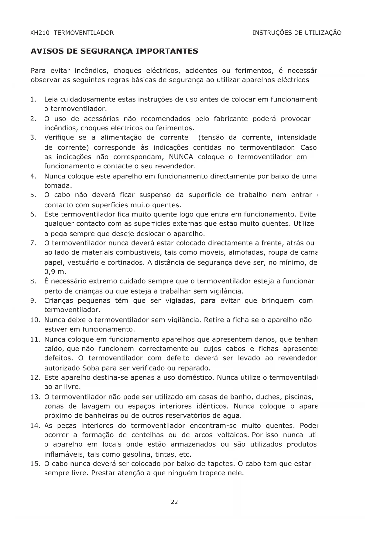 O cabo nunca deverá ser colocado por baixo de tapetes. O cabo tem que estar sempre livre. Prestar atenção a que ninguém tropece nele. XH210 TERMOVENTILADOR