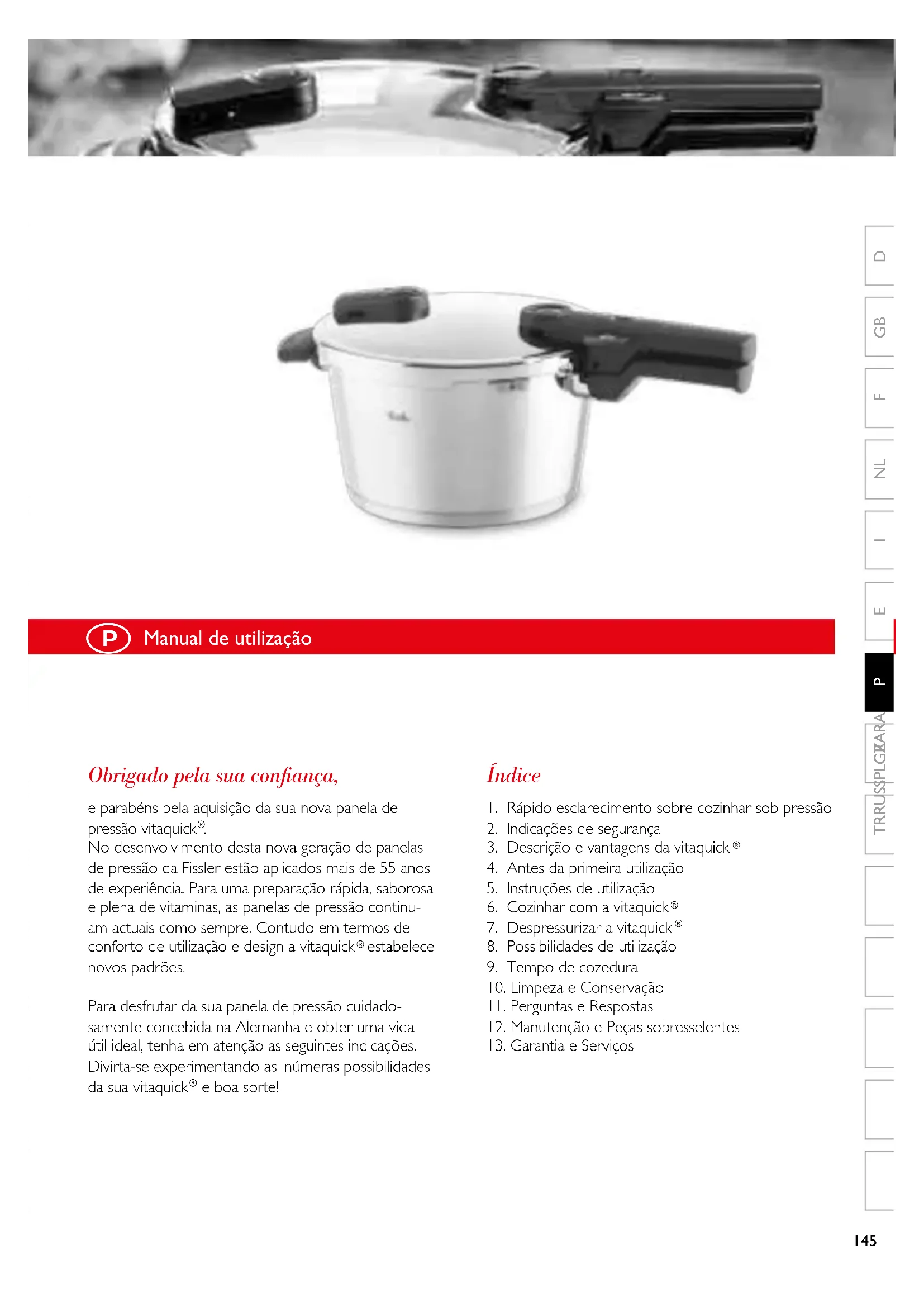Para desfurar da sua panela de pressao cuidadosamente concebida na Alemanha e obter uma vida util ideal, tenha em atencao as segunte indicacoes. Divirta-se experimentando as inumeras possibilidades da sua vitaquick ^電 e boa parte!