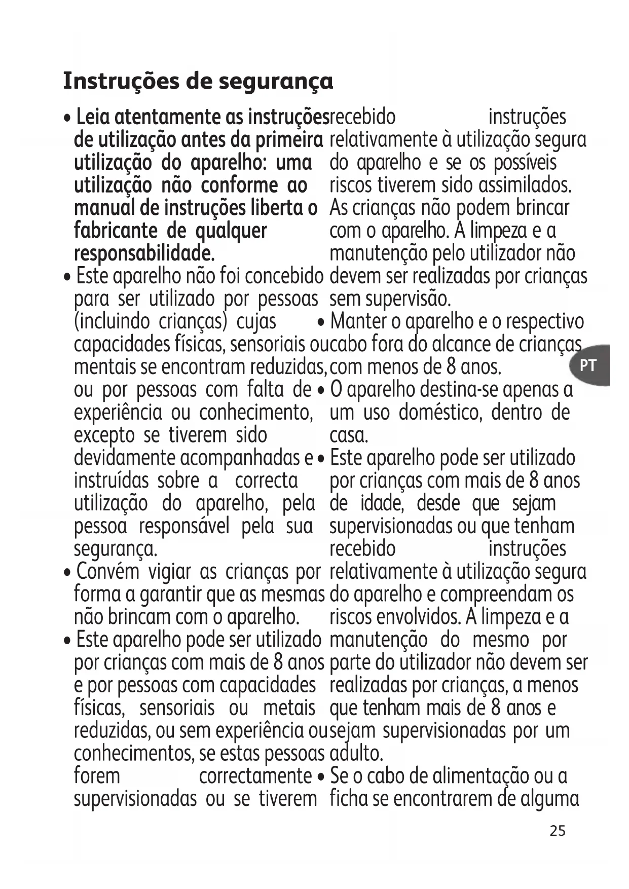 - Este aparelho pode ser utilizado por crianças com mais de 8 anos de idade, desde que sejam supervisionadas ou que tenham recebido instruções relativamente à utilização segura do aparelho e compreendam os riscos envolvidos. A limpeza e a manutenção do mesmo por parte do utilizador não devem ser realizadas por crianças, a menos que tenham mais de 8 anos e sejam supervisionadas por um adulto.