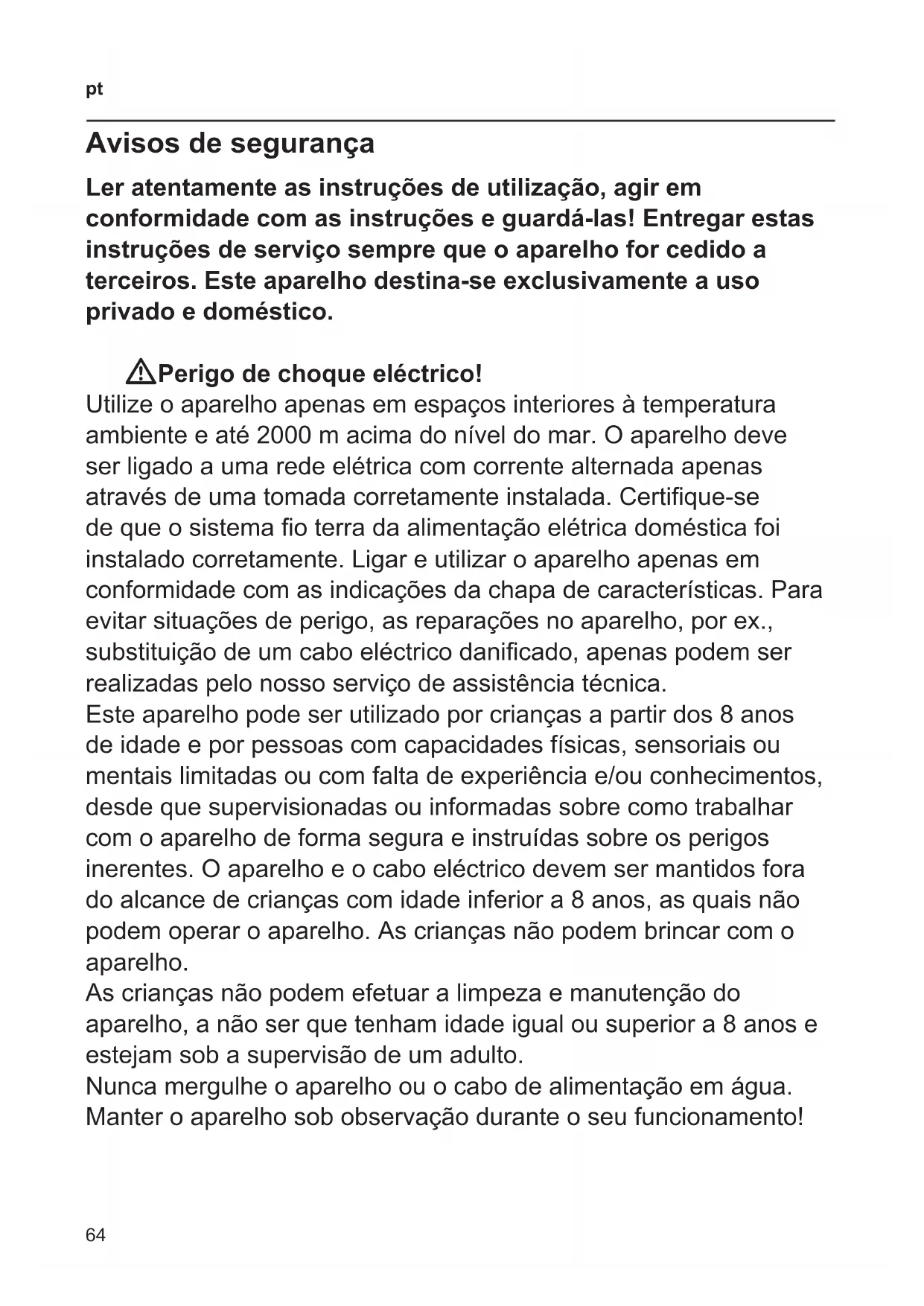 Avisos de segurança Ler atentamente as instruções de utilização, agir em conformidade com as instruções e guardá-las! Entregar estas instruções de serviço sempre que o aparelho for cedido a terceiros. Este aparelho destina-se exclusivamente a uso privado e doméstico. WPerigo de choque eléctrico! Utilize o aparelho apenas em espaços interiores à temperatura ambiente e até 2000 m acima do nível do mar. O aparelho deve ser ligado a uma rede elétrica com corrente alternada apenas através de uma tomada corretamente instalada. Certique-se de que o sistema o terra da alimentação elétrica doméstica foi instalado corretamente. Ligar e utilizar o aparelho apenas em conformidade com as indicações da chapa de características. Para evitar situações de perigo, as reparações no aparelho, por ex., substituição de um cabo eléctrico danicado, apenas podem ser realizadas pelo nosso serviço de assistência técnica. Este aparelho pode ser utilizado por crianças a partir dos 8 anos de idade e por pessoas com capacidades físicas, sensoriais ou mentais limitadas ou com falta de experiência e/ou conhecimentos, desde que supervisionadas ou informadas sobre como trabalhar com o aparelho de forma segura e instruídas sobre os perigos inerentes. O aparelho e o cabo eléctrico devem ser mantidos fora do alcance de crianças com idade inferior a 8 anos, as quais não podem operar o aparelho. As crianças não podem brincar com o aparelho. As crianças não podem efetuar a limpeza e manutenção do aparelho, a não ser que tenham idade igual ou superior a 8 anos e estejam sob a supervisão de um adulto. Nunca mergulhe o aparelho ou o cabo de alimentação em água. Manter o aparelho sob observação durante o seu funcionamento!65