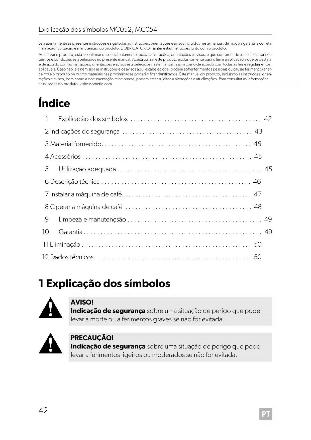 AVISO! Indicação de segurança sobre uma situação de perigo que pode levar à morte ou a ferimentos graves se não for evitada. PRECAUÇÃO! Indicação de segurança sobre uma situação de perigo que pode levar a ferimentos ligeiros ou moderados se não for evitada. DometicMC052-MC054_IOM_4445101699_EMEA17_20xx-xx-xx.book Page 42 Tuesday, August 3, 2021 12:04 PMPT MC052, MC054 Indicações de segurança
