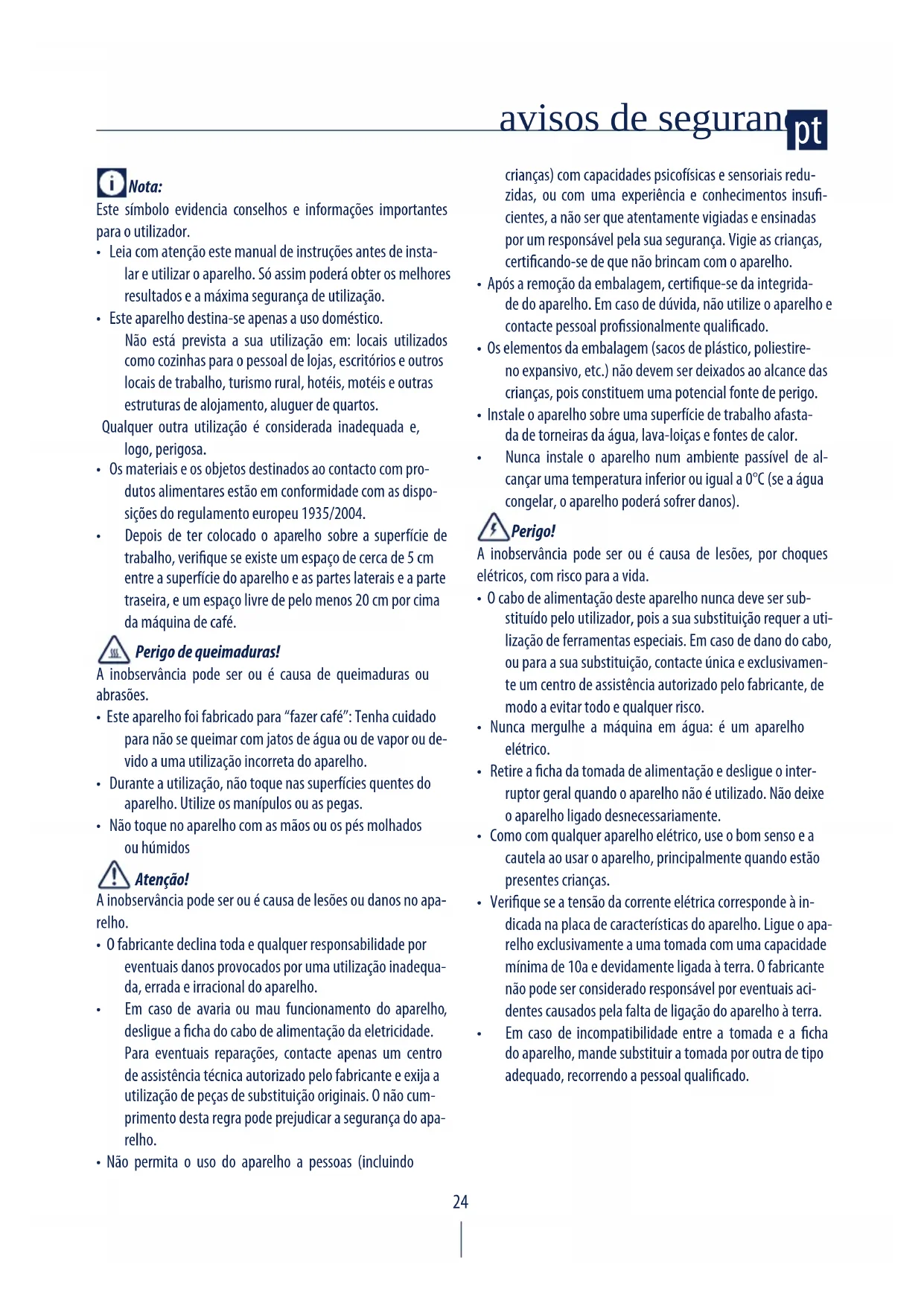 - Este aparelho foi fabricado para “fazer café”: Tenha cuidado para não se queimar com jatos de água ou de vapor ou de- vido a uma utilização incorreta do aparelho.
