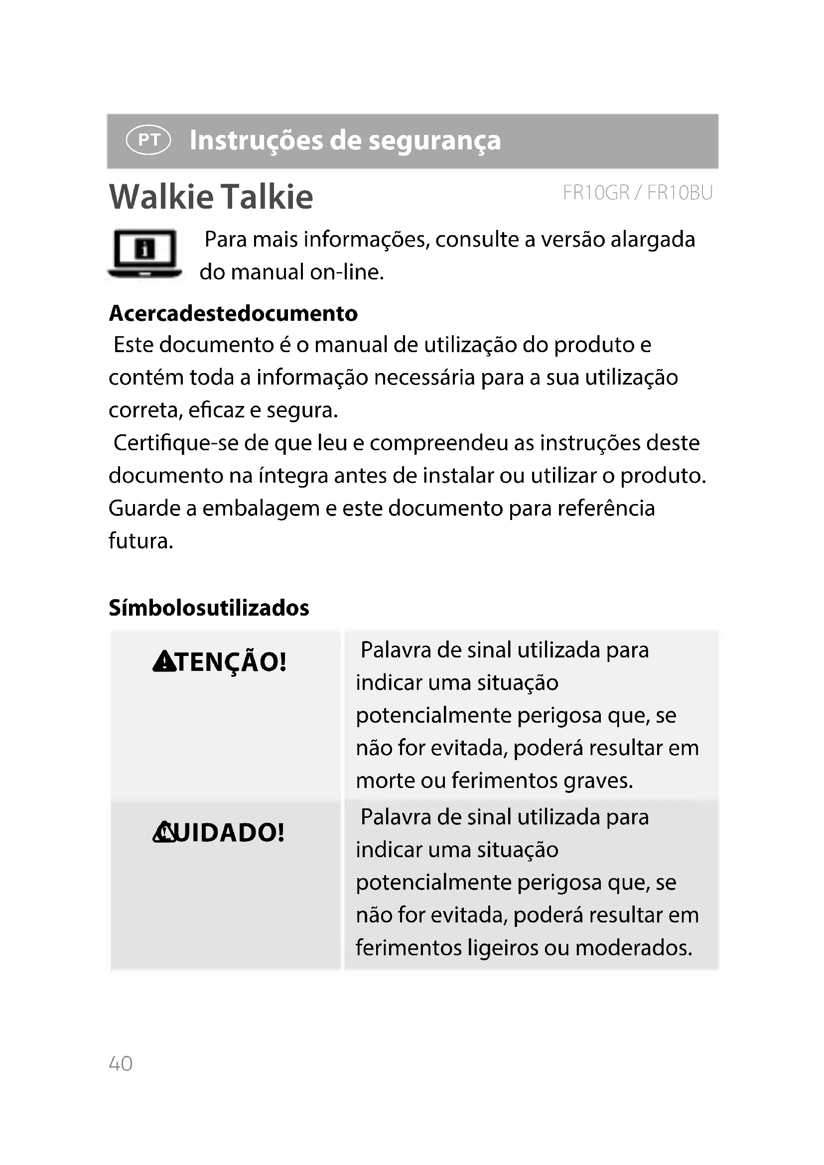 Instruções de segurança Walkie Talkie FR10GR / FR10BU Para mais informações, consulte a versão alargada do manual on-line. Acerca deste documento Este documento é o manual de utilização do produto e contém toda a informação necessária para a sua utilização correta, ecaz e segura. Certique-se de que leu e compreendeu as instruções deste documento na íntegra antes de instalar ou utilizar o produto. Guarde a embalagem e este documento para referência futura. Símbolos utilizados ATENÇÃO! Palavra de sinal utilizada para indicar uma situação potencialmente perigosa que, se não for evitada, poderá resultar em morte ou ferimentos graves. CUIDADO! Palavra de sinal utilizada para indicar uma situação potencialmente perigosa que, se não for evitada, poderá resultar em ferimentos ligeiros ou moderados.41Alecto | Safety instructions AVISO Palavra de sinal utilizada para referir práticas não relacionadas com ferimentos. Especicações Especicação Valor Entrada de alimentação 5 V DC / 2000 mA (adaptador USB não incluído) Tipo de bateria 3 × 1.2 V 800 mAh Utilização prevista Este produto destina-se a ser um dispositivo de comunicação sem os, permitindo aos utilizadores comunicar a distâncias até 6 km em condições de campo aberto. Este produto destina-se a ser utilizado em interiores e exteriores. Qualquer alteração do produto pode ter consequências em termos de segurança, garantia e funcionamento adequado. Este produto não se destina a utilização prossional. Instruções de segurança Certique-se de que leu e compreendeu as instruções deste documento na íntegra antes de instalar ou utilizar o produto. Guarde a embalagem e este documento para referência futura.42