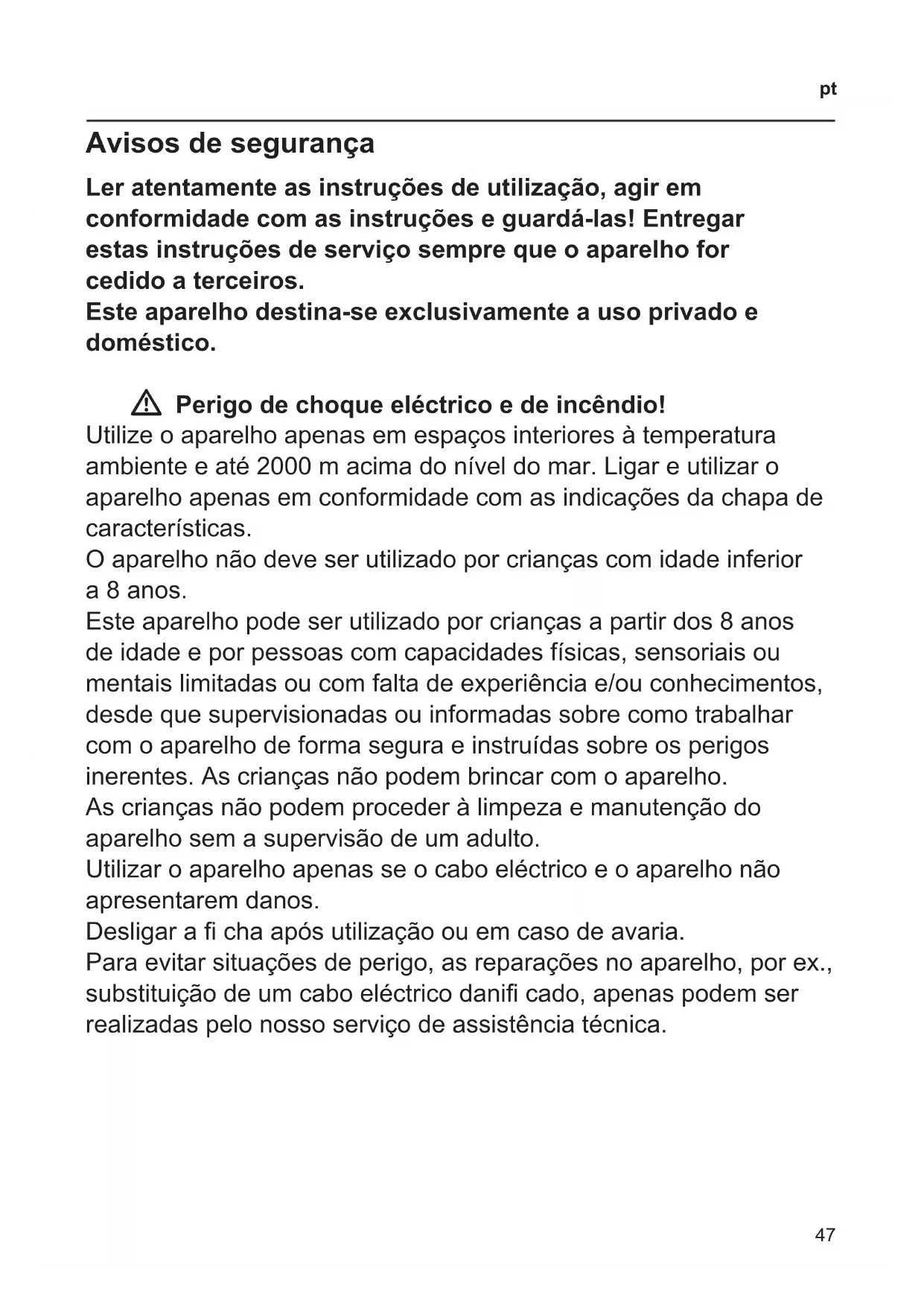 Avisos de segurança Ler atentamente as instruções de utilização, agir em conformidade com as instruções e guardá-las! Entregar estas instruções de serviço sempre que o aparelho for cedido a terceiros. Este aparelho destina-se exclusivamente a uso privado e doméstico. W Perigo de choque eléctrico e de incêndio! Utilize o aparelho apenas em espaços interiores à temperatura ambiente e até 2000 m acima do nível do mar. Ligar e utilizar o aparelho apenas em conformidade com as indicações da chapa de características. O aparelho não deve ser utilizado por crianças com idade inferior a 8 anos. Este aparelho pode ser utilizado por crianças a partir dos 8 anos de idade e por pessoas com capacidades físicas, sensoriais ou mentaislimitadasoucomfaltadeexperiênciae/ouconhecimentos, desde que supervisionadas ou informadas sobre como trabalhar com o aparelho de forma segura e instruídas sobre os perigos inerentes. As crianças não podem brincar com o aparelho. As crianças não podem proceder à limpeza e manutenção do aparelho sem a supervisão de um adulto. Utilizar o aparelho apenas se o cabo eléctrico e o aparelho não apresentarem danos. Desligarachaapósutilizaçãoouemcasodeavaria. Paraevitarsituaçõesdeperigo,asreparaçõesnoaparelho,porex., substituiçãodeumcaboeléctricodanicado,apenaspodemser realizadas pelo nosso serviço de assistência técnica.48