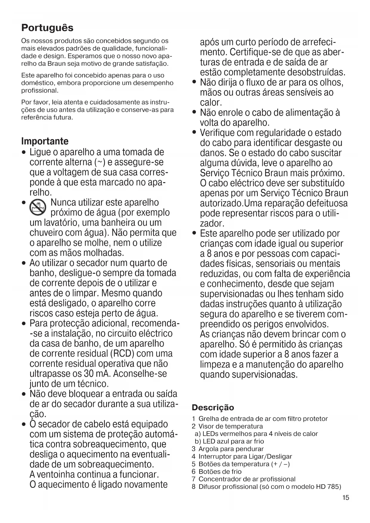 Este aparelho pode ser utilizado por crianças com idade igual ou superior a 8 anos e por pessoas com capaci- dades físicas, sensoriais ou mentais reduzidas, ou com falta de experiência e conhecimento, desde que sejam supervisionadas ou lhes tenham sido dadas instruções quanto à utilização segura do aparelho e se tiverem com- preendido os perigos envolvidos. As crianças não devem brincar com o aparelho. Só é permitido às crianças com idade superior a 8 anos fazer a limpeza e a manutenção do aparelho quando supervisionadas. Descrição 1 Grelha de entrada de ar com filtro protetor 2 Visor de temperatura a) LEDs vermelhos para 4 níveis de calor b) LED azul para ar frio 3 Argola para pendurar 4 Interruptor para Ligar/Desligar 5 Botões da temperatura (+ / –) 6 Botões de frio 7 Concentrador de ar profissional 8 Difusor profissional (só com o modelo HD 785) 96797320_HD785-780_S4-70.indd 1596797320_HD785-780_S4-70.indd 15 07.04.14 08:3807.04.14 08:38 CSS APPROVED Effective Date 8Apr2014 GMT - Printed 18Aug2014 Page 15 of 7016 Utilização Este secador de cabelo permite duas posições de pega: Pega pelo punho (A) para chegar confortavelmente a todos os botões. Pode também pegar diretamente pelo corpo do secador (B). O corpo do secador permanece frio, graças ao sistema de arrefecimento por ar. Ligar Use o interruptor (4) para ligar o aparelho e selecionar o fluxo de ar: O = desligado I = fluxo de ar reduzido II = fluxo de ar elevado Visor de temperatura (2) Os LEDs vermelhos (2a) indicam os níveis de calor entre 1 (baixo) e 4 (alto). O LED azul (2b) acende-se quando se prime um dos botões de frio (6). Regulação da temperatura Quando o aparelho é ligado, é utilizada a última regulação do calor que foi selecionada. Use os botões da temperatura (5) para mudar a temperatura: Prima o botão + para aumentar a temperatura. Prima o botão – para reduzir a temperatura. Pode selecionar a sua temperatura preferida con- forme a sua sensibilidade pessoal ao calor, tipo de cabelo e nível de humidade. Um sensor térmico incorporado assegura o máximo de controlo do calor. Fase fria Os botões de frio (6) permitem alternar instanta- neamente para o fluxo de ar frio, para fixar o pen- teado. Ambos os botões têm a mesma função. Pode premir o botão que lhe for mais cómodo, conforme a maneira como preferir pegar no apa- relho (A ou B). Independentemente da temperatura inicial, obterá instantaneamente um fluxo de ar frio e o LED azul acende-se. Prima novamente um dos botões de frio para con- tinuar a trabalhar à temperatura regulada previa- mente conforme indicado pelos LEDs vermelhos. Tecnologia de iões (só com o modelo HD 785) O fluxo de ar é enriquecido com milhões de iões ativos, que aderem a cada cabelo e reduzem o frisado e a carga estática. O cabelo pode ser modelado mais facilmente e restitui o seu nível de humidade e o brilho natural. Para assegurar um fluxo máximo de iões, use o secador de cabelo sem acessórios, ou pelo menos termine a modelação sem acessórios. Uso do concentrador de ar Para estilizar o cabelo, empurre o concentrador de ar (7) sobre a parte da frente do aparelho e carre- gue com firmeza até encaixar no lugar. O concentrador de ar permite-lhe direcionar o fluxo de ar para secções individuais do cabelo. Tenha em atenção que, ao contrário do que sucede com o corpo do secador, o concentrador de ar é aquecido pelo fluxo de ar quente. Uso do difusor (só com o modelo HD 785) Para criar elevação do cabelo na raiz, volume ou ondas naturais, coloque o difusor (8). Empurre-o com firmeza contra a saída do ar até encaixar no sítio (C). Cabelo curto e médio: Para criar volume e levantar o cabelo da raiz, gire gentilmente os dedos do Difusor em pequenas orbitas circulares sobre o couro cabeludo. Cabelo comprido: Primeiro seque as pontas do cabelo colocando-as em cima do lado com os dedos. Depois levante o cabelo cuidadosamente com o difusor virado para o seu couro cabeludo e mantenha. Para finalizar, seque as raízes do cabelo com um suave movi- mento circular dos dedos sobre o couro cabeludo, criando volume. Limpeza Antes de limpar, desligue o aparelho da tomada de corrente e deixe arrefecer. Para limpar o secador use apenas um pano húmido. Nunca utilize produtos de limpea agressivos ou abrasivos. Nunca utilize objetos pontiagudos (p. ex. a extremidade de um pente) para remover pó ou corpos estranhos do interior do aparelho. Existe o risco de choque elétrico. Limpe regularmente o exterior do filtro protetor (1) com um pano húmido (D). Para uma limpeza aprofundada, pode torcer o filtro protetor para a esquerda e puxá-lo para fora (E). Limpe o filtro protetor sob água corrente e deixe secar por completo. Reponha o filtro protetor e fixe-o rodando-o para a direita. Guardar A argola para pendurar (3) é uma maneira prática e segura de guardar o seu secador de cabelo. Eliminação O produto contém componentes eletrónicos recicláveis. Para proteger o ambiente, não deite o aparelho fora juntamente com o lixo doméstico, leve-o para um ponto de recolha local adequado. 96797320_HD785-780_S4-70.indd 1696797320_HD785-780_S4-70.indd 16 07.04.14 08:3807.04.14 08:38 CSS APPROVED Effective Date 8Apr2014 GMT - Printed 18Aug2014 Page 16 of 7017 Sujeito a alterações sem aviso prévio. Garantia Os nossos produtos dispõem de uma garantia de 2 anos a partir da data de compra. Qualquer defeito do aparelho imputável, quer aos materiais, quer ao fabrico, que torne necessário reparar, substituir peças ou trocar de aparelho dentro de período de garantia não terá custos adicionais. A garantia não cobre avarias por utilização indevida, funcionamento a voltagem diferente da indicada, ligação a uma tomada de cor-rente eléctrica incorrecta, ruptura, desgaste normal por utilização que causem defeitos ou diminuição da qualidade de funcionamento do produto. A garantia perderá o seu efeito no caso de serem efectuadas reparações por p