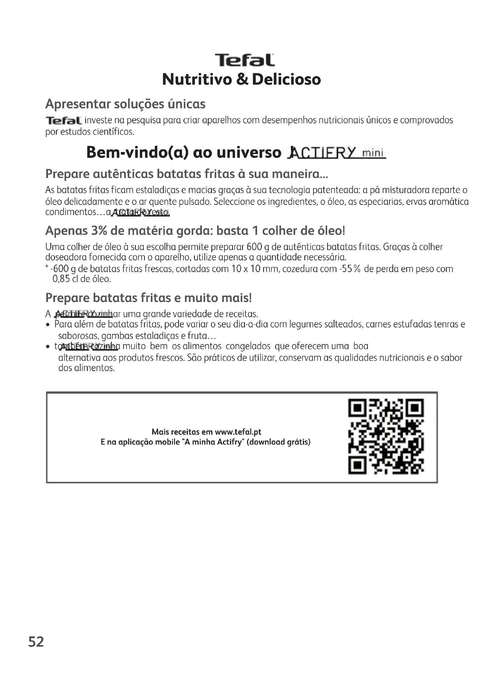 - também cozinha muito bem os alimentos congelados que oferecem uma boa alternativa aos produtos frescos. São práticos de utilizar, conservam as qualidades nutricionais e o sabor dos alimentos. Mais receitas em www.tefal.ptE na aplicação mobile "A minha Actifry" (download grátis)53