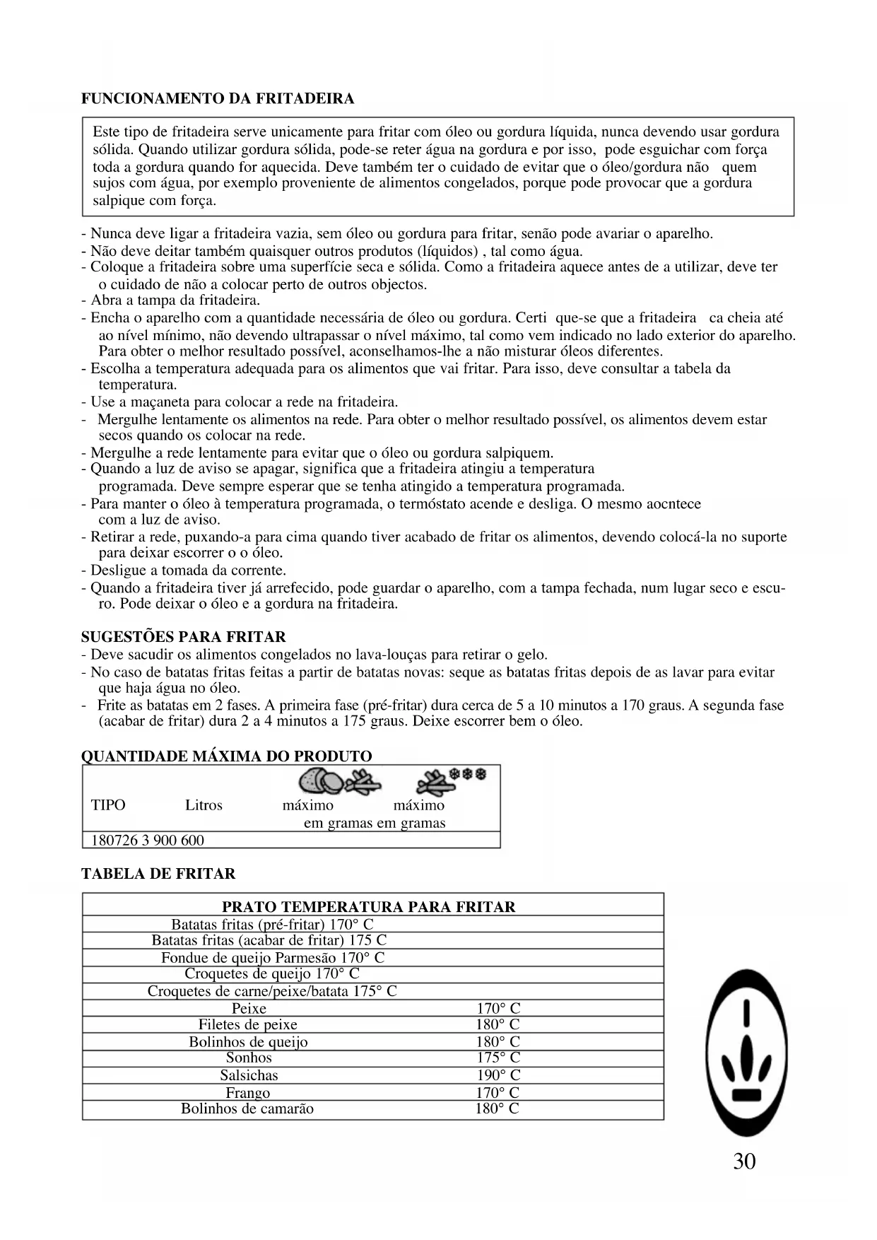 Este tipo de fritadeira serve unicamente para fritar com óleo ou gordura líquida, nunca devendo usar gordura sólida. Quando utilizar gordura sólida, pode-se reter água na gordura e por isso, pode esguichar com força toda a gordura quando for aquecida. Deve também ter o cuidado de evitar que o óleo/gordura não fiquem sujos com água, por exemplo proveniente de alimentos congelados, porque pode provocar que a gordura salpique com força. - Nunca deve ligar a fritadeira vazia, sem óleo ou gordura para fritar, senão pode avariar o aparelho. - Não deve deitar também quaisquer outros produtos (líquidos) , tal como água. - Coloque a fritadeira sobre uma superfície seca e sólida. Como a fritadeira aquece antes de a utilizar, deve ter o cuidado de não a colocar perto de outros objectos. - Abra a tampa da fritadeira. - Encha o aparelho com a quantidade necessária de óleo ou gordura. Certifique-se que a fritadeira fica cheia até ao nível mínimo, não devendo ultrapassar o nível máximo, tal como vem indicado no lado exterior do aparelho. Para obter o melhor resultado possível, aconselhamos-lhe a não misturar óleos diferentes. - Escolha a temperatura adequada para os alimentos que vai fritar. Para isso, deve consultar a tabela da temperatura. - Use a maçaneta para colocar a rede na fritadeira. - Mergulhe lentamente os alimentos na rede. Para obter o melhor resultado possível, os alimentos devem estar secos quando os colocar na rede. - Mergulhe a rede lentamente para evitar que o óleo ou gordura salpiquem. - Quando a luz de aviso se apagar, significa que a fritadeira atingiu a temperatura programada. Deve sempre esperar que se tenha atingido a temperatura programada. - Para manter o óleo à temperatura programada, o termóstato acende e desliga. O mesmo aocntece com a luz de aviso. - Retirar a rede, puxando-a para cima quando tiver acabado de fritar os alimentos, devendo colocá-la no suporte para deixar escorrer o o óleo. - Desligue a tomada da corrente. - Quando a fritadeira tiver já arrefecido, pode guardar o aparelho, com a tampa fechada, num lugar seco e escu- ro. Pode deixar o óleo e a gordura na fritadeira.