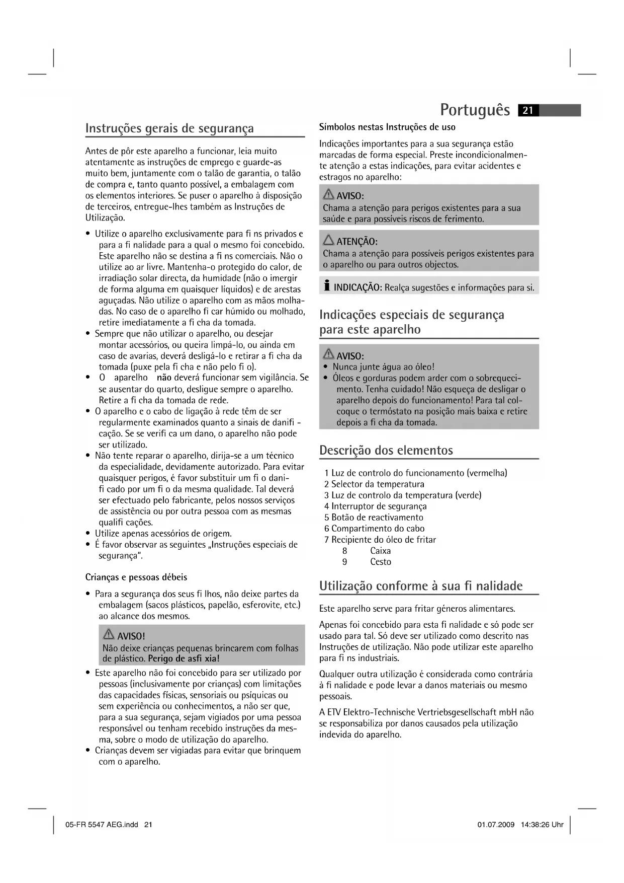 - Óleos e gorduras podem arder com o sobrequeci- mento. Tenha cuidado! Não esqueça de desligar o aparelho depois do funcionamento! Para tal col- coque o termóstato na posição mais baixa e retire depois a cha da tomada. Descrição dos elementos 1 Luz de controlo do funcionamento (vermelha) 2 Selector da temperatura 3 Luz de controlo da temperatura (verde) 4 Interruptor de segurança 5 Botão de reactivamento 6 Compartimento do cabo 7 Recipiente do óleo de fritar 8 Caixa 9 Cesto Utilização conforme à sua nalidade Este aparelho serve para fritar géneros alimentares. Apenas foi concebido para esta nalidade e só pode ser usado para tal. Só deve ser utilizado como descrito nas Instruções de utilização. Não pode utilizar este aparelho para ns industriais. Qualquer outra utilização é considerada como contrária à nalidade e pode levar a danos materiais ou mesmo pessoais. A ETV Elektro-Technische Vertriebsgesellschaft mbH não se responsabiliza por danos causados pela utilização indevida do aparelho. 05-FR 5547 AEG.indd 2105-FR 5547 AEG.indd 21 01.07.2009 14:38:26 Uhr01.07.2009 14:38:26 UhrPortuguês