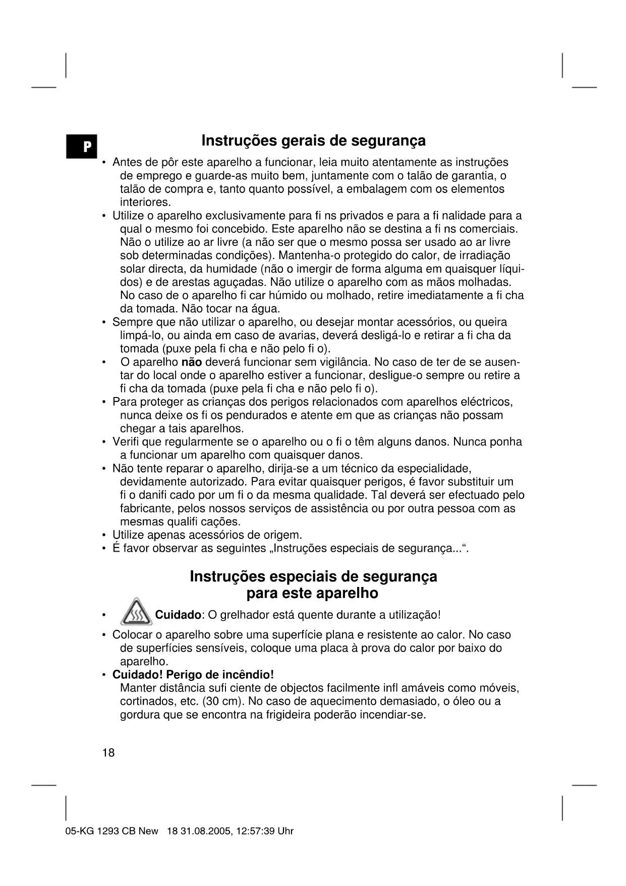 - Cuidado! Perigo de incêndio! Manter distância sufi ciente de objectos facilmente infl amáveis como móveis, cortinados, etc. (30 cm). No caso de aquecimento demasiado, o óleo ou a gordura que se encontra na frigideira poderão incendiar-se. 05-KG 1293 CB New 18 31.08.2005, 12:57:39 UhrP