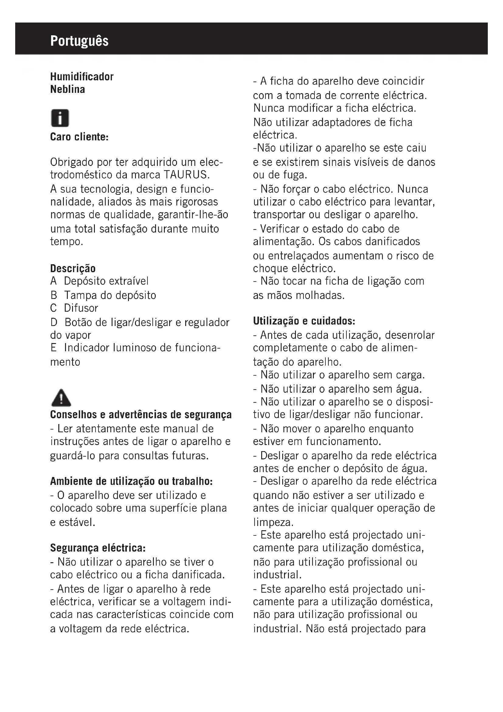 NEBLINA - Humidificador TAURUS - Manual de utilização gratuito