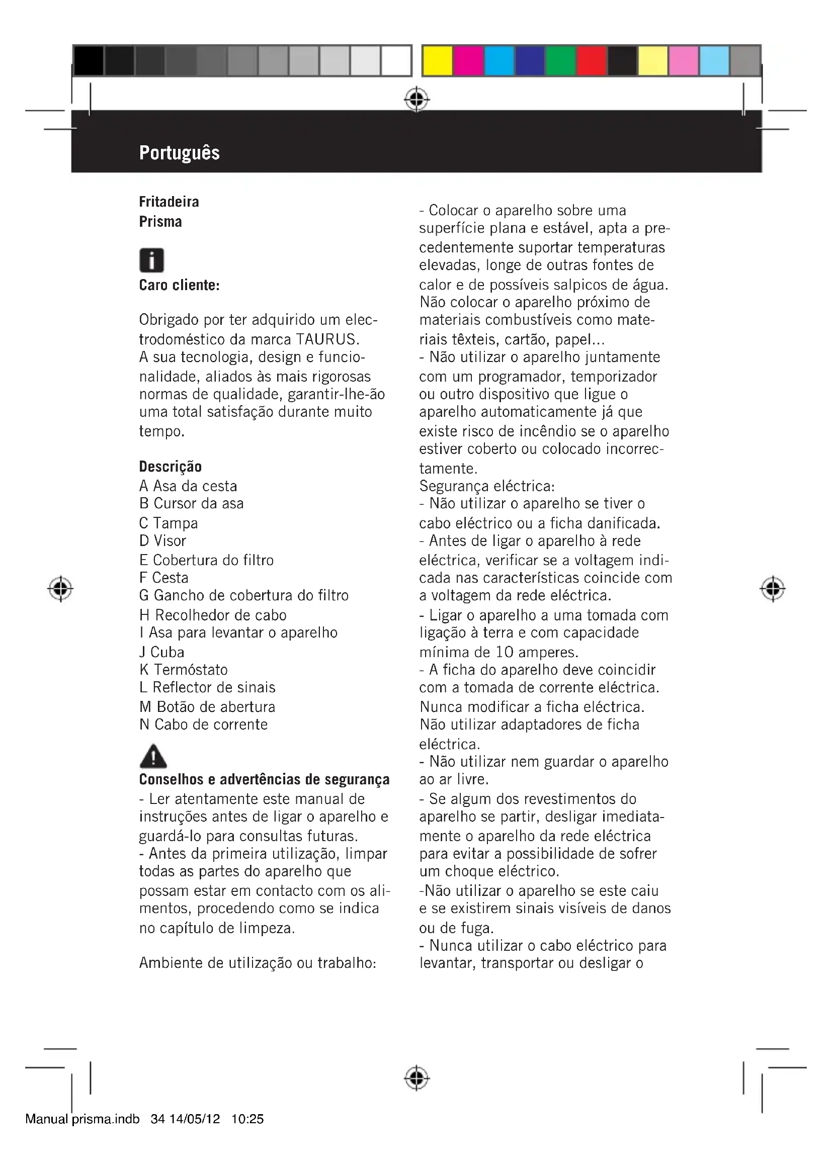 IN QUALUNQUE ALTRO LIQUIDO. - Pulire il gruppo elettrico con un panno umido, ed asciugarlo. - Per la pulizia, non usare solventi o prodotti con pH acido o basico, come la candeggina, oppure prodotti abrasivi. - Non immergere l’apparecchio in acqua o altri liquidi e non metterlo sotto il rubinetto. - Si raccomanda di pulire l’apparecchio periodicamente e di rimuovere tutti i residui di cibo. - I seguenti accessori possono essere lavati in lavastoviglie: (usando un programma di lavaggio corto): - Cestello Anomalie e riparazioni - In caso di guasto, rivolgersi ad un Centro d’Assistenza Tecnica autorizzato. Non tentare di smontare o riparare l’apparecchio: può essere pericoloso. Per i prodotti dell’Unione Europea e/o nel caso in cui sia previsto dalla legislazione del Suo paese di origine: Manual prisma.indb 32 14/05/12 10:25Prodotto ecologico e riciclabile - I materiali che costituiscono l’imballaggio di questo apparecchio sono riciclabili. Per sbarazzarsene, utilizzare gli appositi contenitori pub- blici, adatti per ogni tipo di materiale. - Il prodotto non contiene sostanze dannose per l’ambiente. - Si ricordi che bisogna rispettare le norme relative all’eliminazione di questo tipo di contaminante. Questo simbolo indica che, per smaltire il prodotto al termine della sua durata utile, bisogna depositarlo presso un gestore di residui, autorizzato per la raccolta differenziata di rifiuti di apparecchia- ture elettriche ed elettroniche (RAEE). Questo apparecchio è conforme alla Direttiva 2006/95/CE di Bassa Ten- sione e alla Direttiva 2004/108/CE sulla Compatibilità Elettromagnetica. Manual prisma.indb 33 14/05/12 10:25Português Fritadeira Prisma Caro cliente: Obrigado por ter adquirido um elec- trodoméstico da marca TAURUS. A sua tecnologia, design e funcio- nalidade, aliados às mais rigorosas normas de qualidade, garantir-lhe-ão uma total satisfação durante muito tempo. Descrição A Asa da cesta B Cursor da asa C Tampa D Visor E Cobertura do filtro F Cesta G Gancho de cobertura do filtro H Recolhedor de cabo I Asa para levantar o aparelho J Cuba K Termóstato L Reflector de sinais M Botão de abertura N Cabo de corrente Conselhos e advertências de segurança - Ler atentamente este manual de instruções antes de ligar o aparelho e guardá-lo para consultas futuras. - Antes da primeira utilização, limpar todas as partes do aparelho que possam estar em contacto com os ali- mentos, procedendo como se indica no capítulo de limpeza. Ambiente de utilização ou trabalho: - Colocar o aparelho sobre uma superfície plana e estável, apta a pre- cedentemente suportar temperaturas elevadas, longe de outras fontes de calor e de possíveis salpicos de água. Não colocar o aparelho próximo de materiais combustíveis como mate- riais têxteis, cartão, papel... - Não utilizar o aparelho juntamente com um programador, temporizador ou outro dispositivo que ligue o aparelho automaticamente já que existe risco de incêndio se o aparelho estiver coberto ou colocado incorrec- tamente. Segurança eléctrica: - Não utilizar o aparelho se tiver o cabo eléctrico ou a ficha danificada. - Antes de ligar o aparelho à rede eléctrica, verificar se a voltagem indi- cada nas características coincide com a voltagem da rede eléctrica. - Ligar o aparelho a uma tomada com ligação à terra e com capacidade mínima de 10 amperes. - A ficha do aparelho deve coincidir com a tomada de corrente eléctrica. Nunca modificar a ficha eléctrica. Não utilizar adaptadores de ficha eléctrica. - Não utilizar nem guardar o aparelho ao ar livre. - Se algum dos revestimentos do aparelho se partir, desligar imediata- mente o aparelho da rede eléctrica para evitar a possibilidade de sofrer um choque eléctrico. -Não utilizar o aparelho se este caiu e se existirem sinais visíveis de danos ou de fuga. - Nunca utilizar o cabo eléctrico para levantar, transportar ou desligar o Manual prisma.indb 34 14/05/12 10:25aparelho. - Não enrolar o cabo no aparelho. - Evitar que o cabo eléctrico de ligação entre em contacto com as superfícies quentes do aparelho. - Os cabos danificados ou entrelaça- dos aumentam o risco de choque eléctrico. - Não tocar na ficha de ligação com as mãos molhadas. Utilização e cuidados: - Antes de cada utilização, desenrolar completamente o cabo de alimen- tação do aparelho. - Nunca ligar o aparelho sem antes ter enchido a cuba de óleo. - Não utilizar o aparelho se o disposi- tivo de ligar/desligar não funcionar. - Não deslocar a fritadeira quando estiver a funcionar ou quando o óleo estiver ainda quente. Com a fritadeira em frio, movê-la pelas pegas. - Usar a(s) asa(s) para pegar ou trans- portar o aparelho. - Respeitar os níveis MÁXIMO e MÍNI- MO. (Fig. 1) - Desligar o aparelho da rede eléctrica quando não estiver a ser utilizado e antes de iniciar qualquer operação de limpeza. - Este aparelho está projectado uni- camente para utilização doméstica, não para utilização profissional ou industrial. - Este aparelho está projectado uni- camente para a utilização doméstica, não para utilização profissional ou industrial. Não está projectado para ser utilizado por hóspedes de esta- belecimentos de alojamento do tipo “bed and breakfast”, hotéis, motéis e outros tipos de ambientes residen- ciais, incluindo casas rurais ou áreas de descanso para o pessoal de lojas, escritórios e outros ambientes de trabalho. - Não permitir que seja utilizado por pessoas não familiarizadas com este tipo de produto, pessoas incapacita- das ou crianças. - As crianças devem ser vigiadas para garantir que não brincam com o aparelho. - Nunca deixar o aparelho sem vigilância. Caso sejam utilizados outros mate- riais gordurosos em vez de óleo, será necessário derretê-los previamente num recipiente à parte. Se o material gorduroso tiver en- durecido na fritadeira, faça alguns furos na gordura sólida para permitir que a água possivelmente retida n