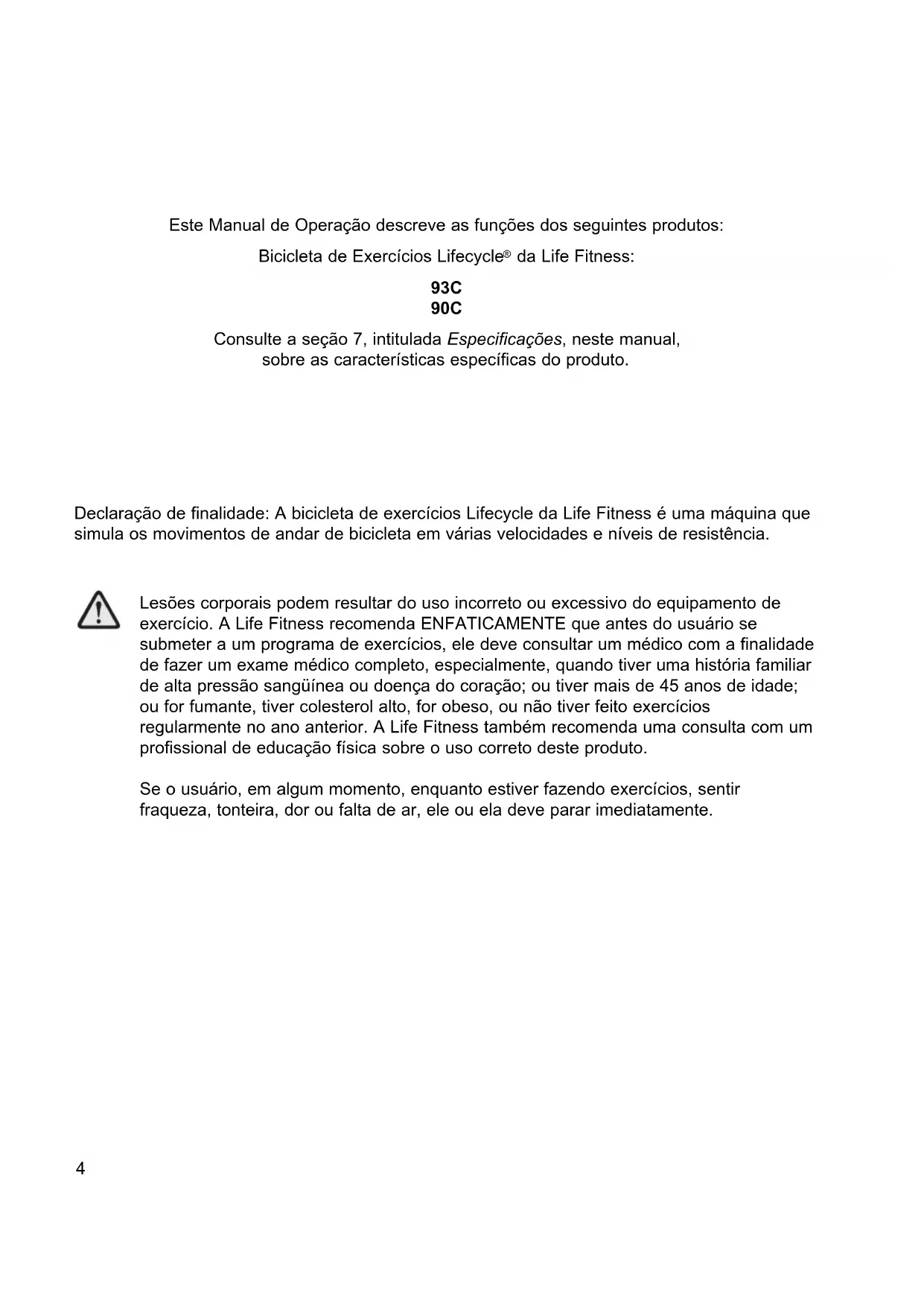Lesões corporais podem resultar do uso incorreto ou excessivo do equipamento de exercico. A Life Fitness recomenda ENFATICAMENTE que antes do usuario se submeter a um programa de exercéricios, eles deve consulutar um médico com a finalidade de fazer um exame Médico complete, especialmente, quando tiver uma-history familiar de alta pressão sanguíinea ou如何去 do correção; ou tiver mais de 45 anos de idade; ou for fumante, tiver colesterol alto, for obeso, ou não tiver feito exercéricios regularamente no ano anterior. A Life Fitness también recomenda uma consulta com um professional de Educação física sobre o uso correto deste produits.