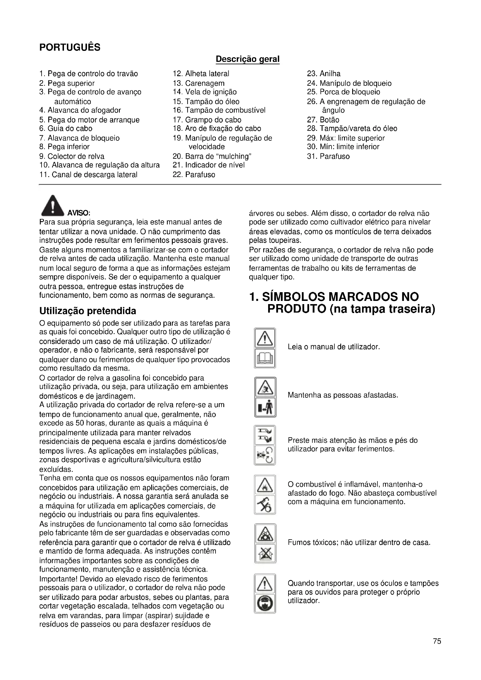 Leia o manual de utilizador. Mantenha as pessoas afastadas. Preste mais atenção às mãos e pés do utilizador para evitar ferimentos. O combustível é inflamável, mantenha-o afastado do fogo. Não abasteça combustível com a máquina em funcionamento. Fumos tóxicos; não utilizar dentro de casa. Quando transportar, use os óculos e tampões para os ouvidos para proteger o próprio utilizador.76