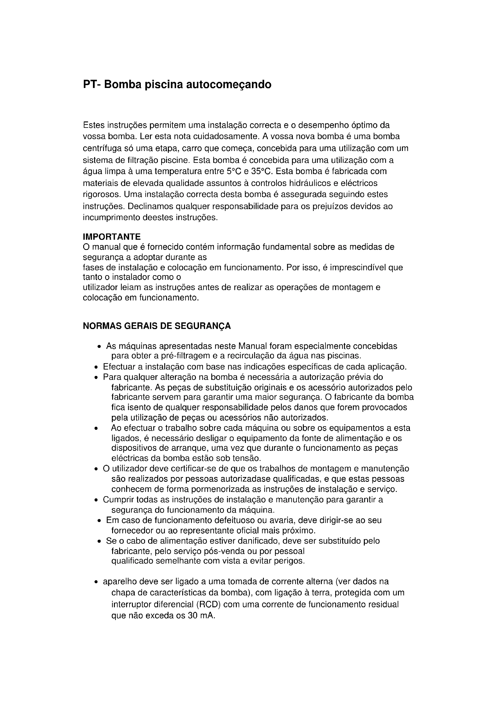 A instalação eléctrica deve ser realizada por profissionais qualificados em instalações eléctricas. Este aparelho não se destina a pessoas com capacidades físicas, sensoriais ou mentais reduzidas ou sem experiência, salvo se tiverem tido supervisão ou instruções acerca da sua utilização por um responsável de segurança. Não permita que crianças ou adultos se apoiem ou sentem no aparelho. As crianças devem ser mantidas sob vigilância. Ajustar convenientemente o valor do relé térmico de acordo com a intensidade da bomba. Existe perigo de electrocussão, caso a ligação à rede eléctrica não seja efectuada de forma adequada. Vermelho (Auxiliar) Amarelo (Principal) Brown Energia Tomada de ligação à terraMontagem de tubos Os tubos ascendentes e a jusante da bomba devem ter diâmetros iguais ou superiores ao da entrada da bomba. Para evitar as perdas de fricção, do tubo PVC de diâmetro 50mm (2in) mínimo deve ser utilizado. Aumentar o diâmetro para comprimentos mais importantes de tubo. Os tubos de aspiração e de quitação não devem em caso algum permanecer sobre a bomba. Efectivamente selar todas as conexões e a tampa da bomba para evitar as gotas de água sobre motor, o que poderia danificar-o. Controlos antes de arranque Antes de colocar a bomba em funcionamento, é necessário realizar as seguintes operações: Verificar que a tensão fornecida assim como a frequência corresponde à placa que encontra-se sobre a bomba. Antes do arranque inicial, preencher a bomba com a água para auto-cebante da bomba. Comprovar que a tensão e potência da rede eléctrica correspondem aos valores indicados na placa de características da bomba. A bomba pode funcionar continuamente. Arranque Começar a bomba apenas quando os tubos de aspiração e de quitação são conectados à entrada e a saída da bomba. Verificar que não há obstáculos nos tubos. Manteniment e limpeza A vossa nova bomba da piscina não tem necessidade de entrevista especial ou de programação.No caso ou a bomba não é utilizado durante certo tempo, é aconselhado desmontar-o, de limpar-o,e de arranjar-o numa lugar seca e bem aerado. Se o fio eléctrico for danificado, deve ser substituído por fabricando, o seu agente, ou qualquer outrapessoa qualificada a fim de evitar qualquer perigo. Limpar regularmente a vossa bomba retirando os restos do vosso filtro, para que o tubo de entrada não bloqueie ou não danifique a bomba. Os componentes da bomba que, devido à sua utilização habitual, sofram desgaste e/ou deterioração devem ser repostos periodicamente para manter o bom rendimento da bomba Verificar periodicamente: o A correcta fixação das peças mecânicas e o estado dos parafusos de suporte da máquina. o A correcta posição, a fixação e o estado dos condutores de alimentação e das peças isolantes. A temperatura da máquina e do motor eléctrico. Em caso de anomalia, parar imediatamente a máquina e recorrer ao Serviço de Assistência Técnica mais próximo. o As vibrações da máquina. Em caso de anomalia, parar imediatamente a máquina e recorrer ao Serviço de Assistência Técnica mais próximo.