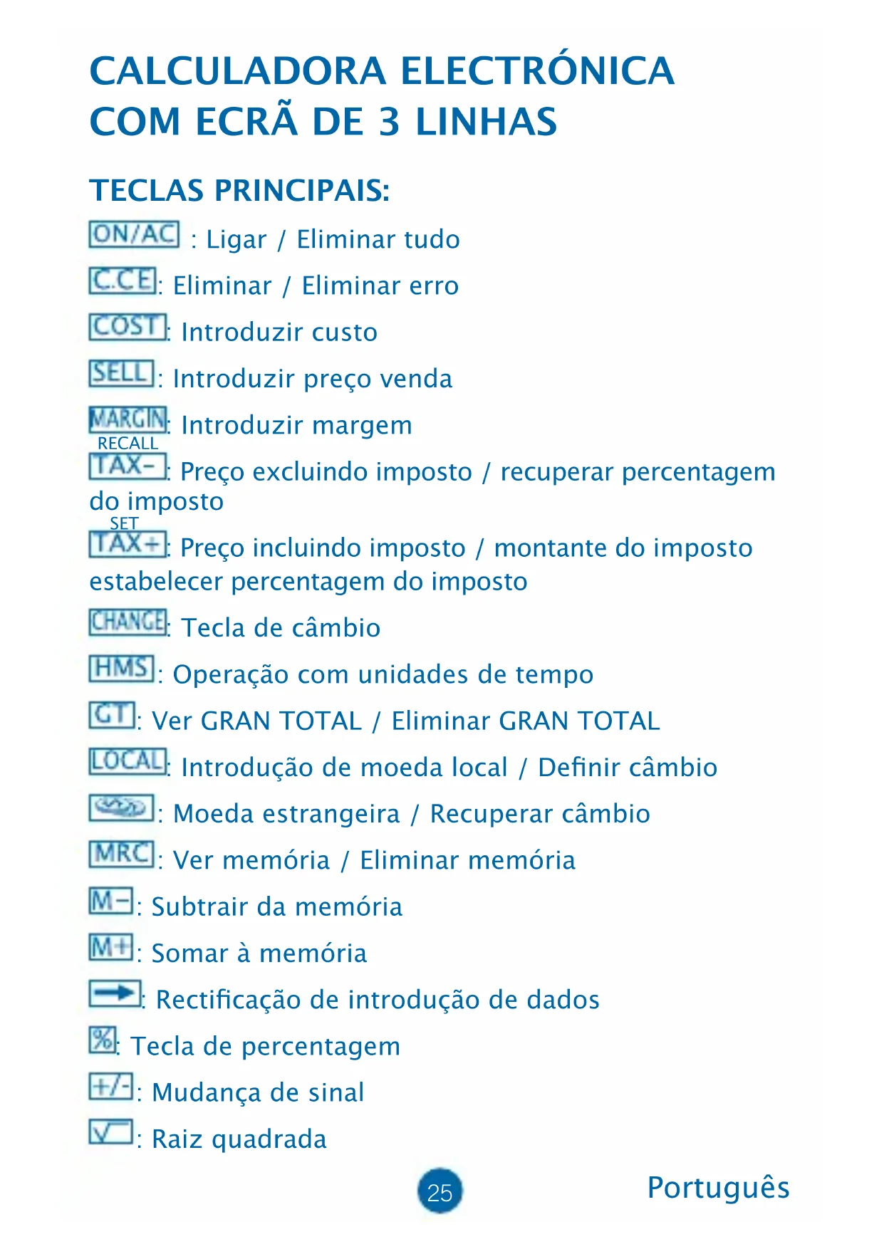 TECLAS PRINCIPAIS: : Ligar / Eliminar tudo : Eliminar / Eliminar erro : Introduzir custo : Introduzir preço venda : Introduzir margem : Preço excluindo imposto / recuperar percentagem do imposto : Preço incluindo imposto / montante do imposto estabelecer percentagem do imposto : Tecla de câmbio : Operação com unidades de tempo : Ver GRAN TOTAL / Eliminar GRAN TOTAL : Introdução de moeda local / Denir câmbio : Moeda estrangeira / Recuperar câmbio : Ver memória / Eliminar memória : Subtrair da memória : Somar à memória : Recticação de introdução de dados : Tecla de percentagem : Mudança de sinal : Raiz quadrada RECALL SET26 DESCRIÇÃO DOS SELECTORES:
