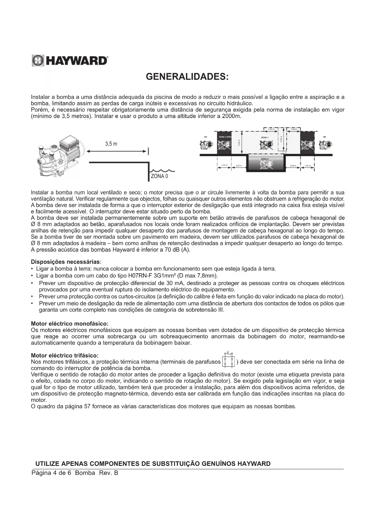 Para sua informação Nota REGISTOUTILIZE APENAS COMPONENTES DE SUBSTITUIÇÃO GENUÍNOS HAYWARD Página 4 de 6 Bomba Rev. B GENERALIDADES: Instalar a bomba a uma distância adequada da piscina de modo a reduzir o mais possível a ligação entre a aspiração e a bomba, limitando assim as perdas de carga inúteis e excessivas no circuito hidráulico. Porém, é necessário respeitar obrigatoriamente uma distância de segurança exigida pela norma de instalação em vigor (mínimo de 3,5 metros). Instalar e usar o produto a uma altitude inferior a 2000m. ZONA 2 ZONA 2 ZONA 0 1,50 m 2,50 m 2,50 m 1,50 m 2,00 m 2,00 m 1,50 m ZONA 1 1,50 m