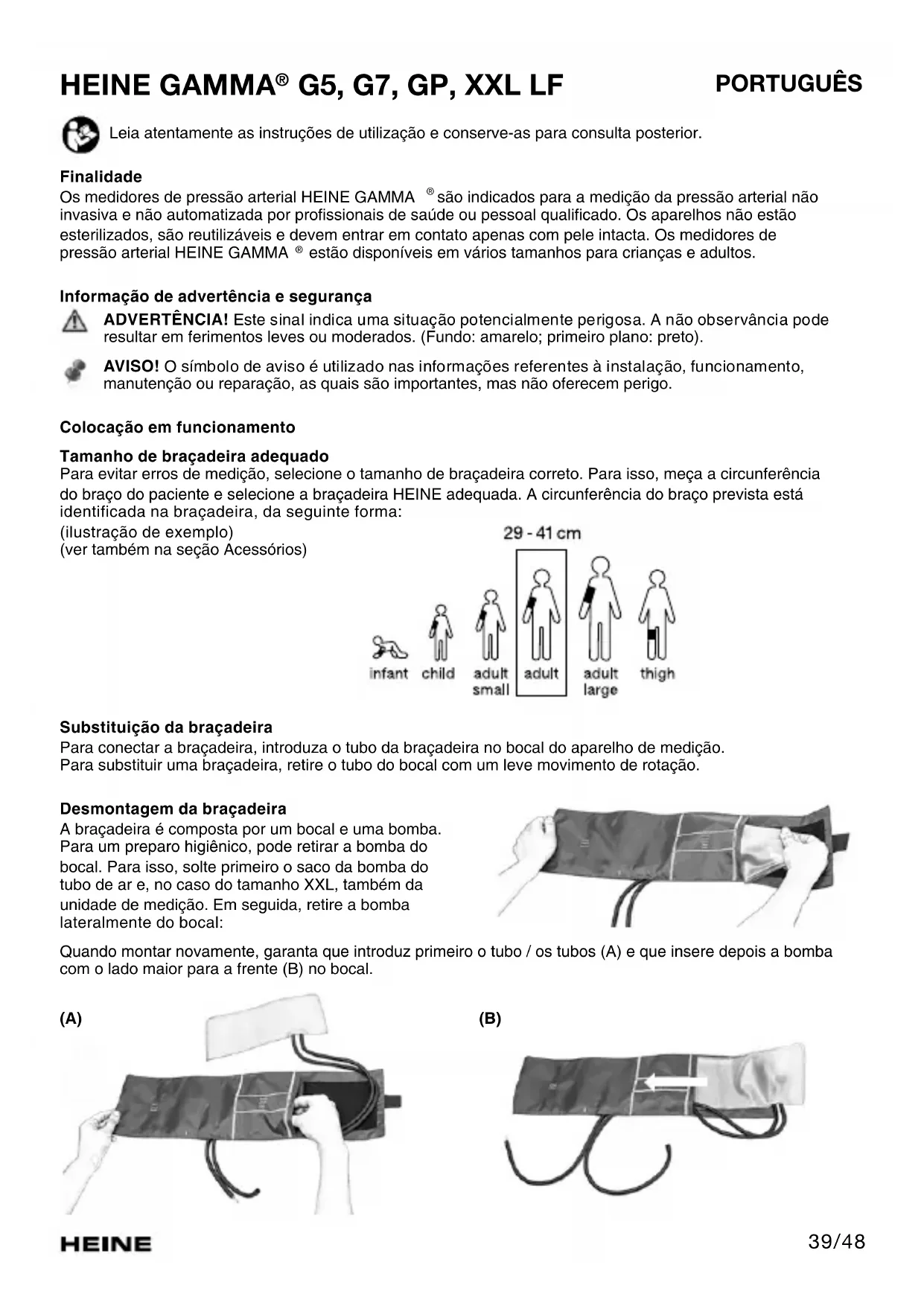 Os medicores de pressão arterial HEINE GAMMA são indicados para a medicação da pressão arterial não invasiva e não automatizada por professionais de Saúde ou pessoalrial. Os apareiros não estao esterilizados, são reutilizaveis e devementrar em contato apenas com pele intacta. Os medicores de pressão arterial HEINE GAMMA estado disponiveis em various tamanhos para crianças e adultos.