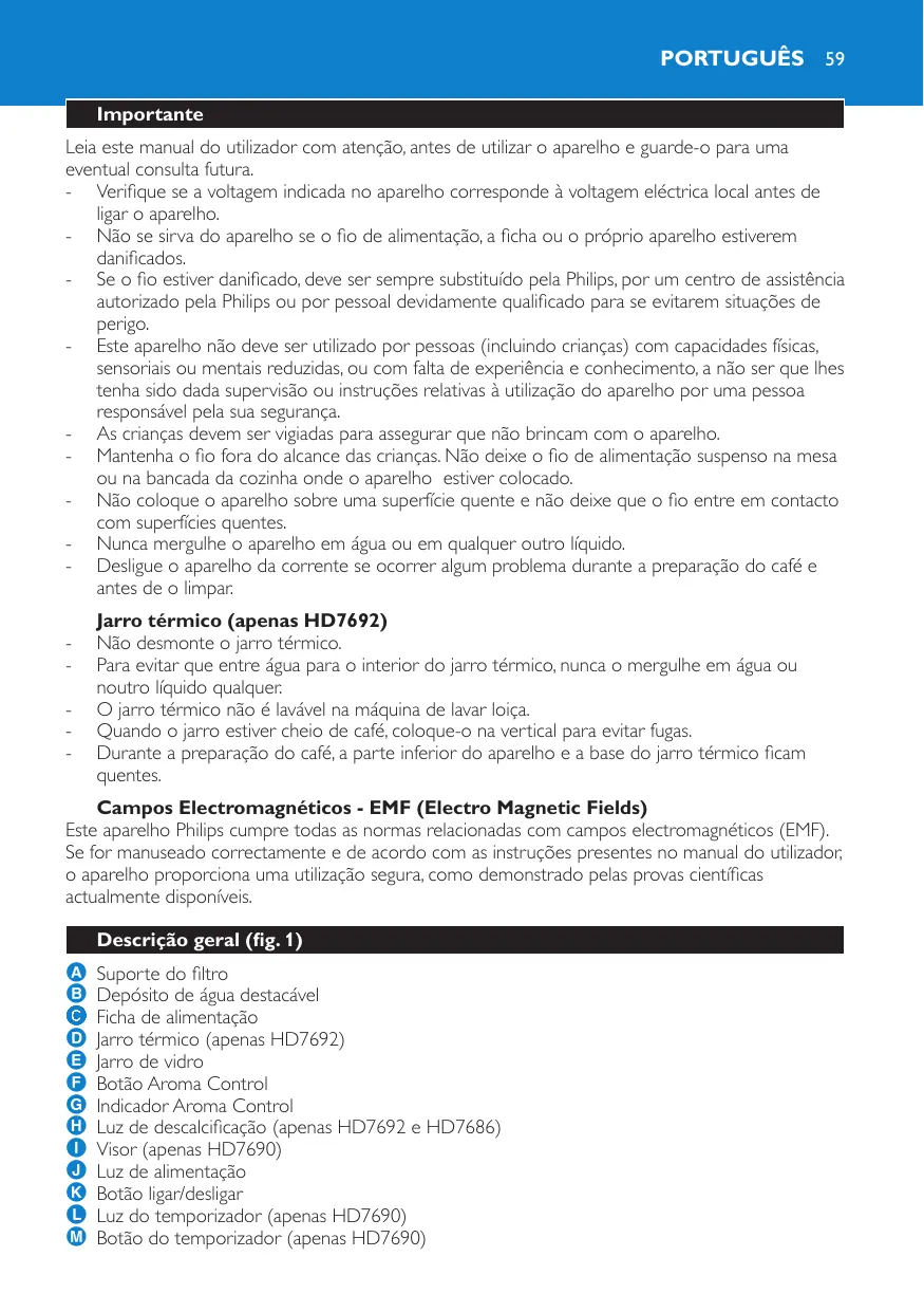 Ikke kast apparatet som restavfall når det ikke kan brukes lenger. Lever det på en gjenvinningsstasjon.Ved å gjøre dette hjelper du til med å ta vare på miljøet (fig. 23). Garanti og service Hvis du trenger service eller informasjon, kan du gå til Philips’ Internett-sider på www.philips.com eller ta kontakt med Philips’ kundestøtte der du er (du finner telefonnummeret i garantiheftet). Hvis det ikke finnes noen Philips-kundestøtte der du bor, kan du ta kontakt med den lokale Philipsforhandleren eller serviceavdelingen ved Philips Domestic Appliances and Personal Care BV. Português 59 Importante Leia este manual do utilizador com atenção, antes de utilizar o aparelho e guarde-o para uma eventual consulta futura. - Verifique se a voltagem indicada no aparelho corresponde à voltagem eléctrica local antes de ligar o aparelho. - Não se sirva do aparelho se o fio de alimentação, a ficha ou o próprio aparelho estiverem danificados. - Se o fio estiver danificado, deve ser sempre substituído pela Philips, por um centro de assistência autorizado pela Philips ou por pessoal devidamente qualificado para se evitarem situações de perigo. - Este aparelho não deve ser utilizado por pessoas (incluindo crianças) com capacidades físicas, sensoriais ou mentais reduzidas, ou com falta de experiência e conhecimento, a não ser que lhes tenha sido dada supervisão ou instruções relativas à utilização do aparelho por uma pessoa responsável pela sua segurança. - As crianças devem ser vigiadas para assegurar que não brincam com o aparelho. - Mantenha o fio fora do alcance das crianças. Não deixe o fio de alimentação suspenso na mesa ou na bancada da cozinha onde o aparelho estiver colocado. - Não coloque o aparelho sobre uma superfície quente e não deixe que o fio entre em contacto com superfícies quentes. - Nunca mergulhe o aparelho em água ou em qualquer outro líquido. - Desligue o aparelho da corrente se ocorrer algum problema durante a preparação do café e antes de o limpar.