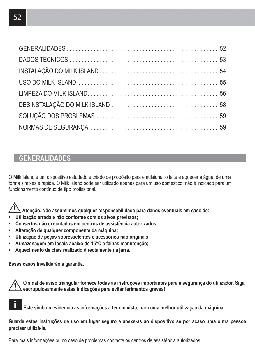 Atença: antes de utilizes o Milk Island sera preciso limpar a jarra e os demais componentes. Certifique-se de que todos os componentes estejam instalados correctamente. O vidro da jarra pode alcantar temperatas elevadas: perigo de queimaduras! Utilize o Milk Island so com agua e leite. É proibidoutilizá-lo com outros liquidos de qualquer natureza ou composicao química.