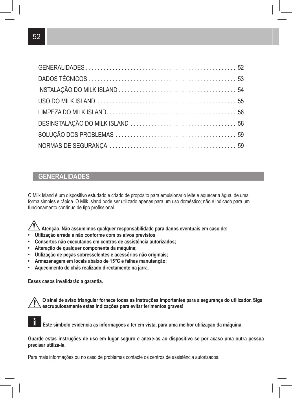 Atença: antes de utilizes o Milk Island sera preciso limpar a jarra e os demais componentes. Certifique-se de que todos os componentes estejam instalados correctamente. O vidro da jarra pode alcantar temperatas elevadas: perigo de queimaduras! Utilize o Milk Island so com agua e leite. É proibidoutilizá-locomothersliquidosdequalquernaturezaou composicaoquímica.