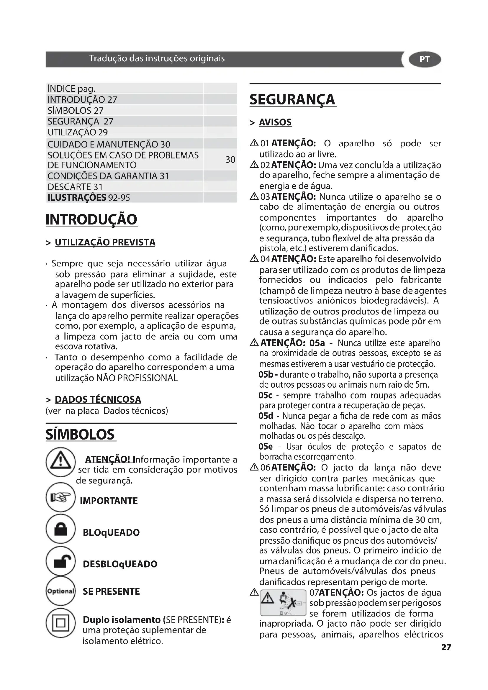 07ATENÇÃO: Os jactos de água sob pressão podem ser perigosos se forem utilizados de forma inapropriada. O jacto não pode ser dirigido para pessoas, animais, aparelhos eléctricosPT