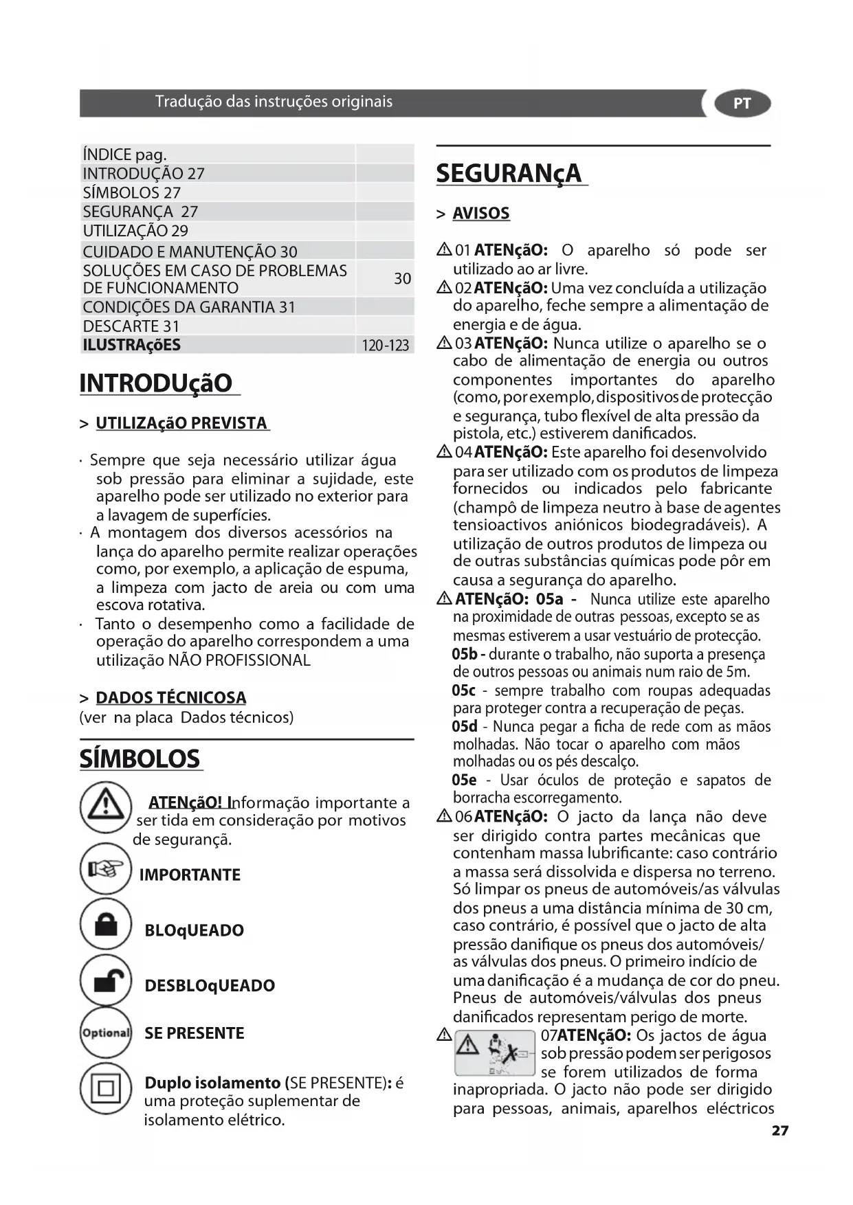 07ATENçãO: Os jactos de água sob pressão podem ser perigosos se forem utilizados de forma inapropriada. O jacto não pode ser dirigido para pessoas, animais, aparelhos eléctricosPT