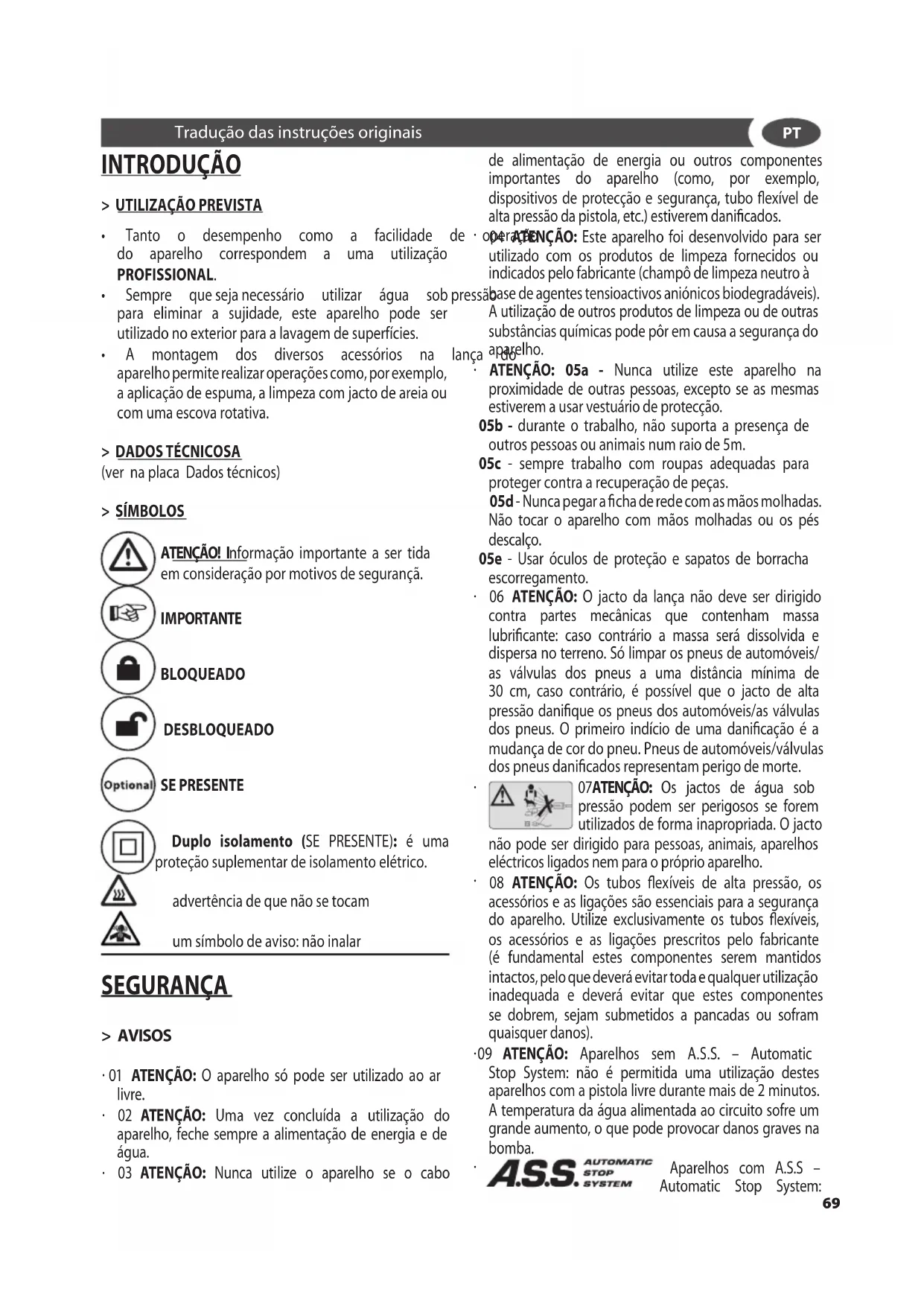 Aparelhos com A.S.S – Automatic Stop System: INTRODUÇÃO > UTILIZAçãO PREVISTA
