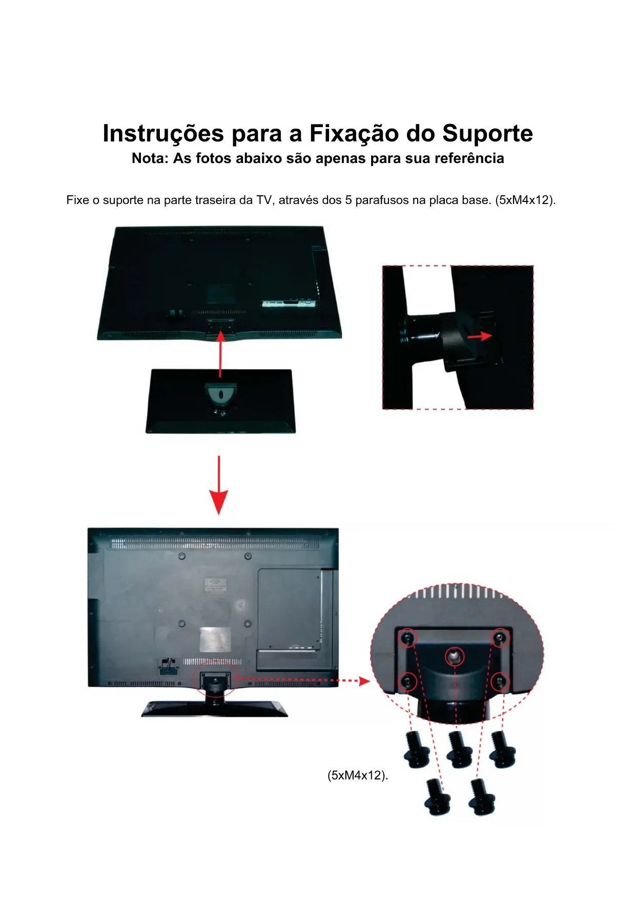 Fixe o suporte na parte traseira da TV, através dos 5 parafusos na placac base. (5xM4x12).