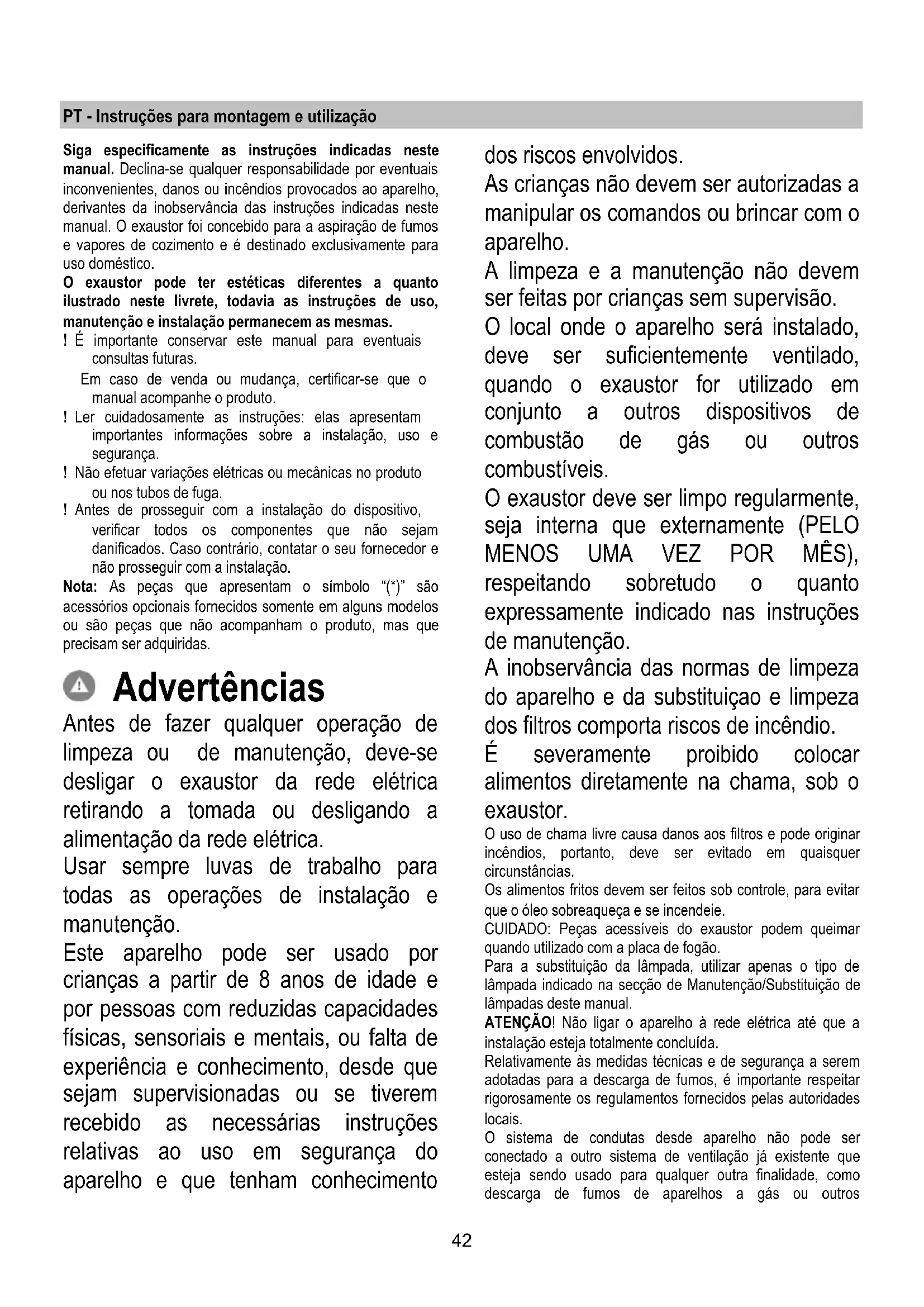 Si la iluminación no funciona, antes de llamar al servicio de asistencia técnica, revisar que las lámparas estén correctamente instaladas.42 PT - Instruções para montagem e utilização Siga especificamente as instruções indicadas neste manual. Declina-se qualquer responsabilidade por eventuais inconvenientes, danos ou incêndios provocados ao aparelho, derivantes da inobservância das instruções indicadas neste manual. O exaustor foi concebido para a aspiração de fumos e vapores de cozimento e é destinado exclusivamente para uso doméstico. O exaustor pode ter estéticas diferentes a quanto ilustrado neste livrete, todavia as instruções de uso, manutenção e instalação permanecem as mesmas. ! É importante conservar este manual para eventuais consultas futuras. Em caso de venda ou mudança, certificar-se que o manual acompanhe o produto. ! Ler cuidadosamente as instruções: elas apresentam importantes informações sobre a instalação, uso e segurança. ! Não efetuar variações elétricas ou mecânicas no produto ou nos tubos de fuga. ! Antes de prosseguir com a instalação do dispositivo, verificar todos os componentes que não sejam danificados. Caso contrário, contatar o seu fornecedor e não prosseguir com a instalação. Nota: As peças que apresentam o símbolo “(*)” são acessórios opcionais fornecidos somente em alguns modelos ou são peças que não acompanham o produto, mas que precisam ser adquiridas. Advertências Antes de fazer qualquer operação de limpeza ou de manutenção, deve-se desligar o exaustor da rede elétrica retirando a tomada ou desligando a alimentação da rede elétrica. Usar sempre luvas de trabalho para todas as operações de instalação e manutenção. Este aparelho pode ser usado por crianças a partir de 8 anos de idade e por pessoas com reduzidas capacidades físicas, sensoriais e mentais, ou falta de experiência e conhecimento, desde que sejam supervisionadas ou se tiverem recebido as necessárias instruções relativas ao uso em segurança do aparelho e que tenham conhecimento dos riscos envolvidos. As crianças não devem ser autorizadas a manipular os comandos ou brincar com o aparelho. A limpeza e a manutenção não devem ser feitas por crianças sem supervisão. O local onde o aparelho será instalado, deve ser suficientemente ventilado, quando o exaustor for utilizado em conjunto a outros dispositivos de combustão de gás ou outros combustíveis. O exaustor deve ser limpo regularmente, seja interna que externamente (PELO MENOS UMA VEZ POR MÊS), respeitando sobretudo o quanto expressamente indicado nas instruções de manutenção. A inobservância das normas de limpeza do aparelho e da substituiçao e limpeza dos filtros comporta riscos de incêndio. É severamente proibido colocar alimentos diretamente na chama, sob o exaustor. O uso de chama livre causa danos aos filtros e pode originar incêndios, portanto, deve ser evitado em quaisquer circunstâncias. Os alimentos fritos devem ser feitos sob controle, para evitar que o óleo sobreaqueça e se incendeie. CUIDADO: Peças acessíveis do exaustor podem queimar quando utilizado com a placa de fogão. Para a substituição da lâmpada, utilizar apenas o tipo de lâmpada indicado na secção de Manutenção/Substituição de lâmpadas deste manual. ATENÇÃO! Não ligar o aparelho à rede elétrica até que a instalação esteja totalmente concluída. Relativamente às medidas técnicas e de segurança a serem adotadas para a descarga de fumos, é importante respeitar rigorosamente os regulamentos fornecidos pelas autoridades locais. O sistema de condutas desde aparelho não pode ser conectado a outro sistema de ventilação já existente que esteja sendo usado para qualquer outra finalidade, como descarga de fumos de aparelhos a gás ou outros43 combustíveis. Não utilizar ou deixar o exaustor sem lâmpadas corretamente montadas, devido ao possível risco de choques elétricos. Nunca utilizar o exaustor sem as grades montadas corretamente. O exaustor NUNCA deve ser utilizado como uma superfície de apoio, a menos que não seja especificamente indicado. Usar somente os parafusos de fixação fornecidos com o aparelho, para a instalação, ou, se não for fornecido, comprar o tipo de parafuso correto. Usar o comprimento correto para os parafusos que são identificados no Guia de Instalação. Em caso de dúvida, consultar um centro de assistência autorizado ou pessoa qualificada similar. ATENÇÃO! A falta de instalação de parafusos ou dispositivos de fixação em conformidade com estas instruções, pode resultar em riscos elétricos. Este aparelho está classificado de acordo com a Diretiva Europeia 2012/19/EC sobre Resíduos de equipamento elétrico e eletrónico (REEE). Ao garantir a eliminação adequada deste produto, estará a ajudar a evitar potenciais consequências negativas para o ambiente e para a saúde pública, que poderiam derivar de um manuseamento de dispersão inadequada deste produto. O símbolo no produto ou nos documentos que acompanham o produto, indica que este aparelho não pode receber um tratamento semelhante ao de uma dispersão doméstica. Pelo contrário, deverá ser depositado no respectivo centro de recolha para a reciclagem de equipamento elétrico e eletrónico. A eliminação deverá ser efetuada em conformidade com as normas ambientais locais para a eliminação de desperdícios. Para obter informações mais detalhadas sobre o tratamento, a recuperação e a reciclagem deste produto, contate o Departamento na sua localidade, o seu serviço de eliminação de desperdícios domésticos ou a loja onde adquiriu o produto. Aparelho projetado, testado e fabricado de acordo com: